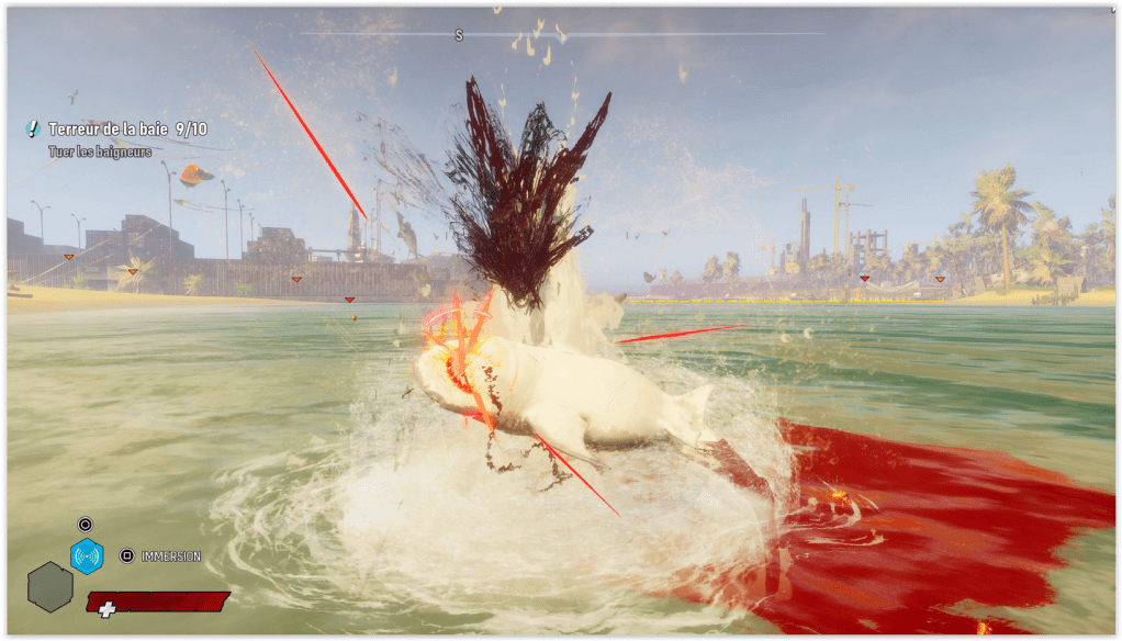 Étant donné que c’est un show, une voix off vient accompagnée l’aventure et permet d’éviter l’ennui des fonds marins. Concernant le gameplay, vous vous en doutez, c’est cruellement plaisant de manier un requin, on contrôle pas Némo, c’est clairement pas pour les enfants. On peut mordre, donner des coups de queues, faire un salto hors de l’eau, tout y est pour bouffer du vacancier. Comme j’ai dit en intro, le jeu est un RPG en monde ouvert, donc forcément faudra s’attendre à gagner des points d’expériences et débloquer des zones mais surtout des particularités pour votre requin. Le gros soucis du titre, c’est qu’il est très répétitif, les missions se ressemblent pour la plupart et ça c’est dû à un gameplay finalement assez pauvre mais c’est normal car notre héros n’est qu’un requin. Et on pourrait s’attendre à quelque chose de différent avec les Boss, c’est le cas car c’est clairement différent des autres missions mais tous les combats de Boss se ressemblent.