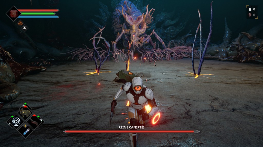 Donc comme les Souls, on a une attaque légère et une attaque lourde, parait, bloquer des attaques. La seule différence par rapport aux Souls, ici dans ce titre, vous pouvez avoir une arme à distance, une sorte d’arme à feu.