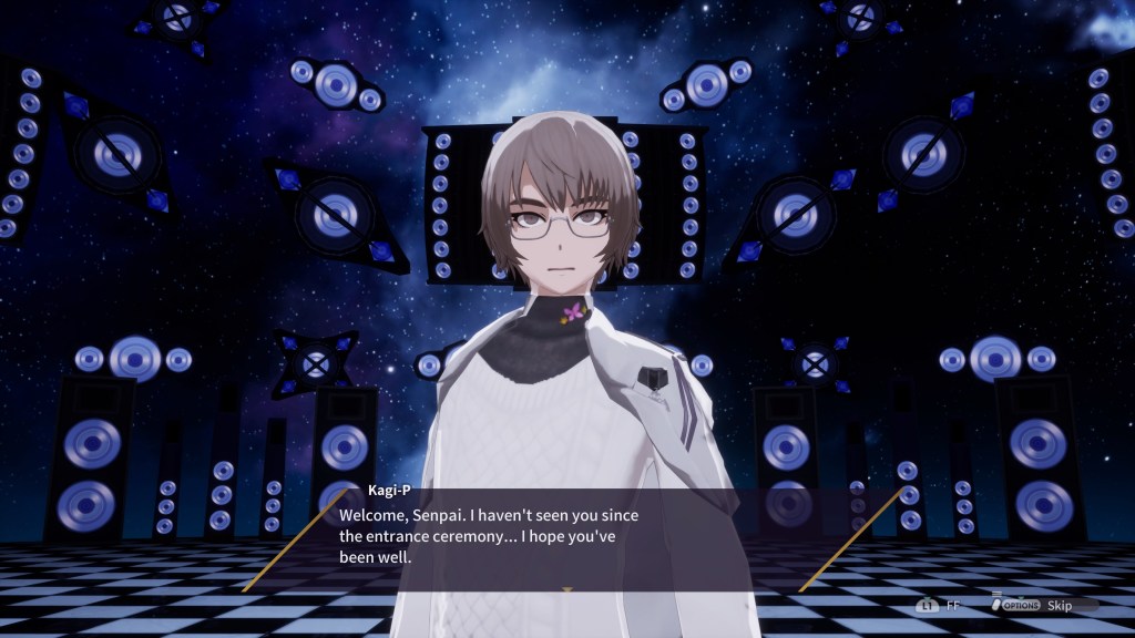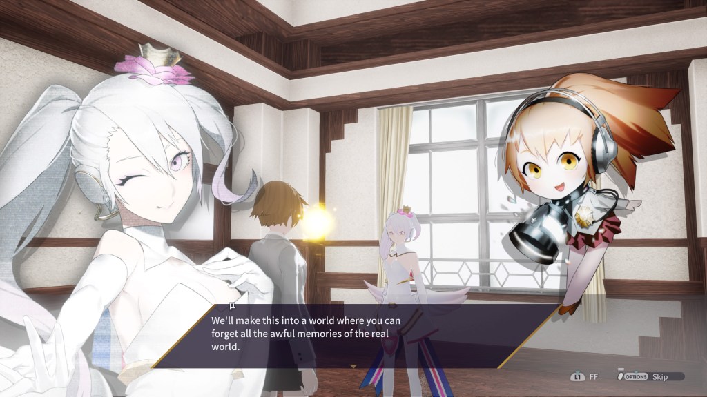 Entrons maintenant dans le vif du sujet. Un peu d’histoire pour commencer. Nous allons donc évoluer dans le monde de Mobius, endroit virtuel sensé être parfait, où l’on peut vivre sa vie et oublier tous les tracas de la vie réelle. Un monde utopique dirigé par l’intelligence artificielle μ (prononcé Mew) et sa horde de serviteurs dévoués, qui diffuseront partout sa musique. Une sorte d’Hatsune Miku en sommes …. Vous vous rendrez vite compte que cette vie irréelle cache de nombreux secrets et qu’il faudra vous échapper. Nous allons donc rejoindre le Go-Home Club sorte de groupe de résistance et tenter en compagnie de nos nouveaux amis, de retrouver le monde réel.