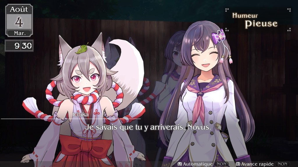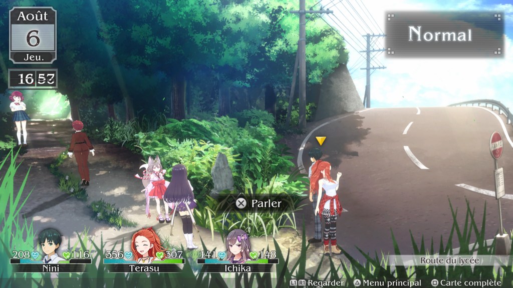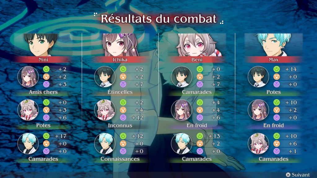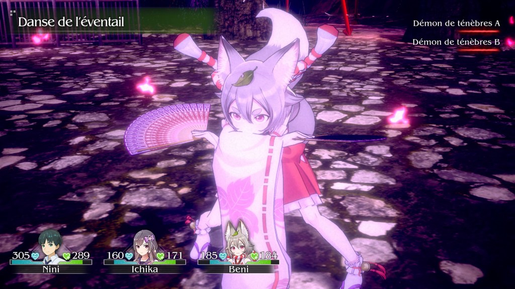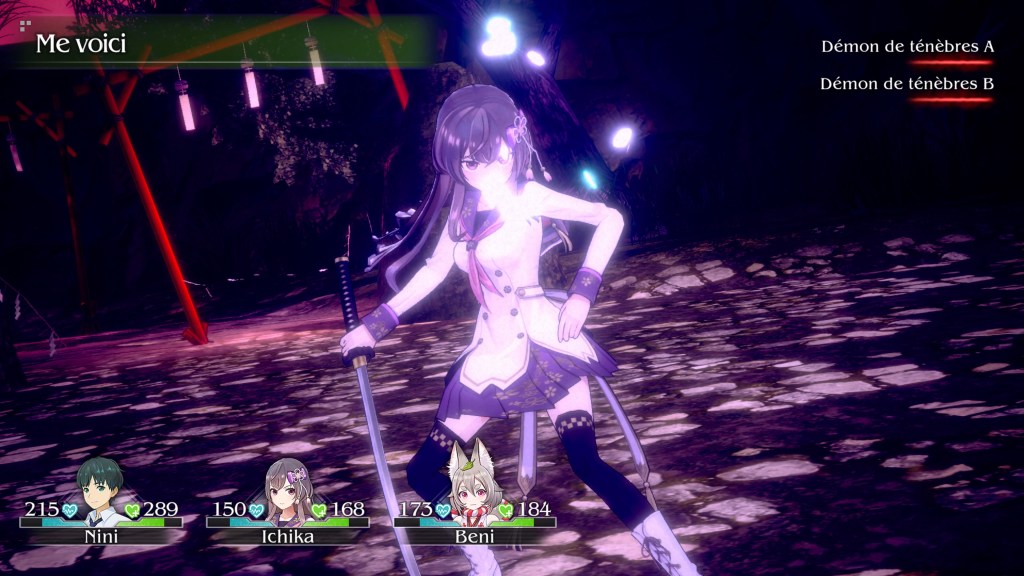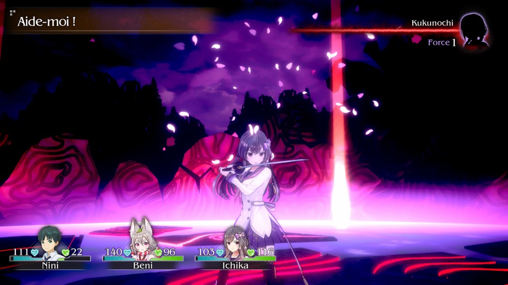 Pour ce qui est du gameplay, ça reste basique et assez statique. Le côté visual novel étant assez prononcé, le bouton X est celui qui est le plus sollicité forcément. Lors des phases d’actions, les combats se déroulent au tour par tour, ce qui vous permettra de prendre votre temps pour choisir au mieux vos options. À noter que vous diriger uniquement le personnage de Nini, les autres membres de votre équipe sont en mode automatique et agiront en fonction de l’affinité que vous aurez avec eux. Donc plus vous serez proche d’eux et plus ils seront efficace sur le champ de bataille. L’aspect RPG n’est que théorique car peu de variables personnalisables. J’aurais aimé que l’on puisse plus agir sur des changements visuels d’armes ou de tenues par exemple. Mais qu’importe le jeu est déjà bien cool et l’on s’amuse bien, ce qui est tout même le but recherché n’est-ce pas ?