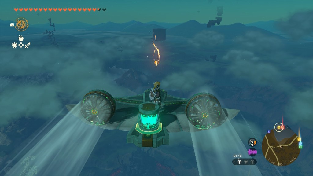 Concernant le gameplay, on reprend 100% du gameplay de Breath of the Wild mais en y ajoutant des grosses nouveautés. Ce n’est pas un spoile car on les a vu dans les divers présentations de Nintendo concernant le jeu, Link a des nouveaux pouvoirs. Un premier intitulé « Emprise », qui lui permet de porter à distance des objets et de les coller ensemble pour concevoir des véhicules et autres merdes du genre. Bref un gros délire Minecraft. Puis un second appelé « Rétrospective » qui permet de faire remonter le temps d’un objet. Un troisième nommé « Almagame » qui permet de faire fusionner des objets avec des armes, histoire de faire monter leur puissance. Et un dernier intitulé « Infiltration » qui permet à notre héros de traverser les plafonds pour grimper plus vite. Donc quatre pouvoirs qui permettent d’avancer plus librement dans l’univers de Zelda Tears of the Kingdom.
