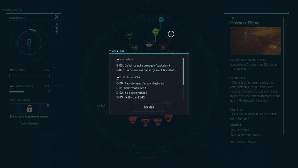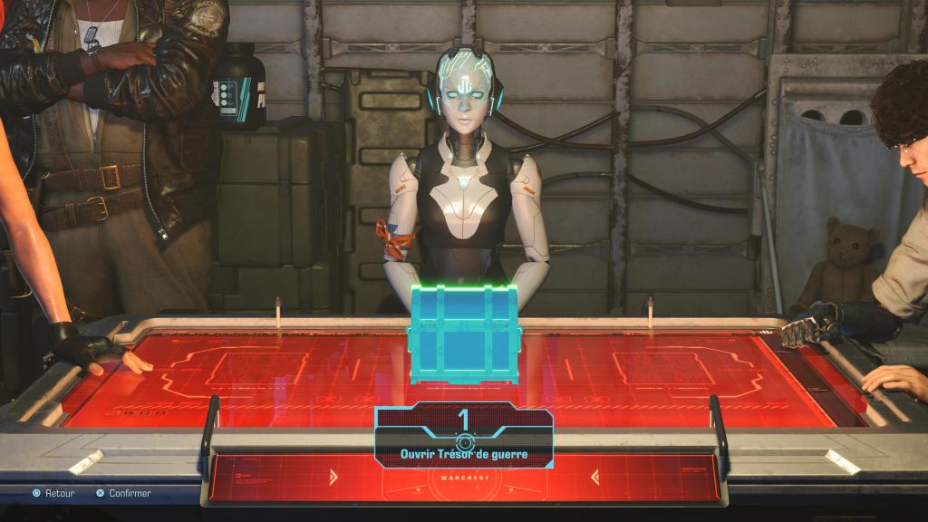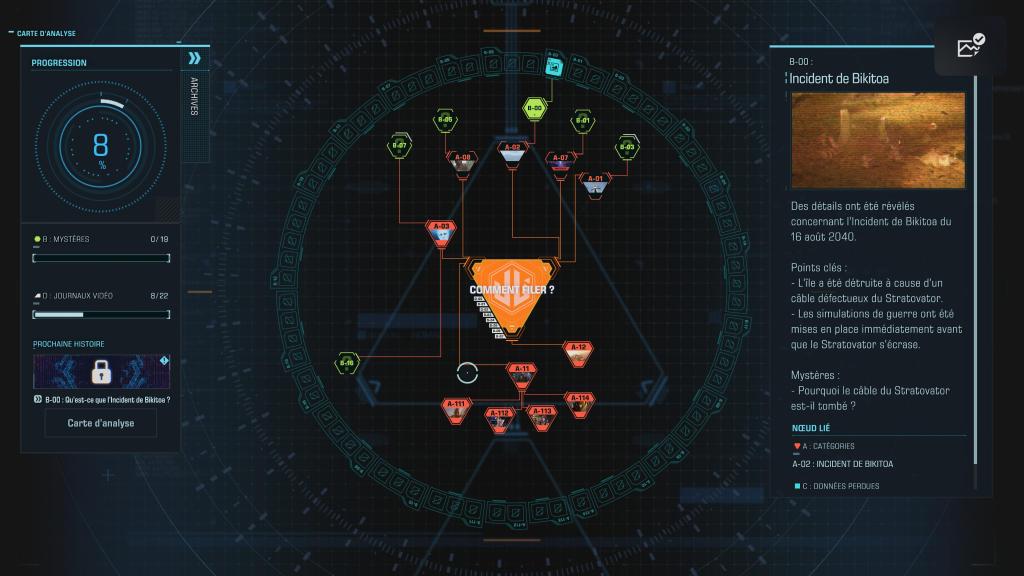 Bien sûr on a de la customisation qu’on peut acheter avec la monnaie du jeu ou avec votre pognon, des autocollants tout ça, bref des trucs bien éclatés. Et il y a un Pass de combat gratuit et un payant, qui personnellement j’ai reçu avec la clé du jeu. Le Pass gratuit, c’est 10 objets et le Pass premium, c’est 50. On a aussi un menu pour la partie histoire, c’est une grosse base de données qui regroupent les données qu’on récupère en enchaînant les parties et ça permet de débloquer des discussions mais aussi des cinématiques. Toutes cette partie est en VOSTFR alors que la voix de l’IA pendant les parties est en Français. Ne me demandez pas pourquoi, sûrement un manque de temps des développeurs ou de budget. Mais bon la voix de l’IA, on dirait clairement la vieille voix robotique de Google trad…
