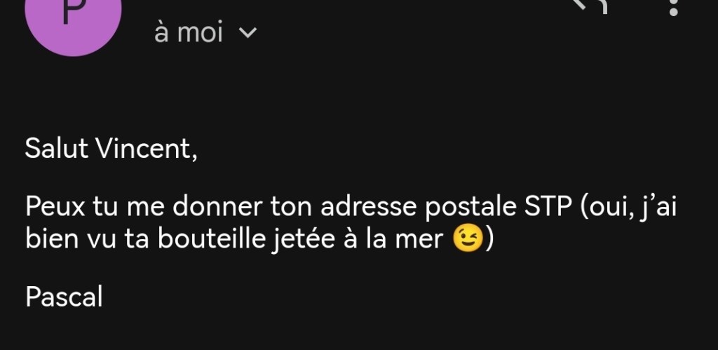 Sur le coup, je n’ai pas réfléchi, j’ai donné mon adresse direct, désolé mais j’étais content et oui, je suis comme Balou, il m’en faut peu pour être heureux… 🎶
