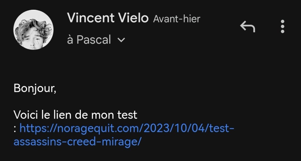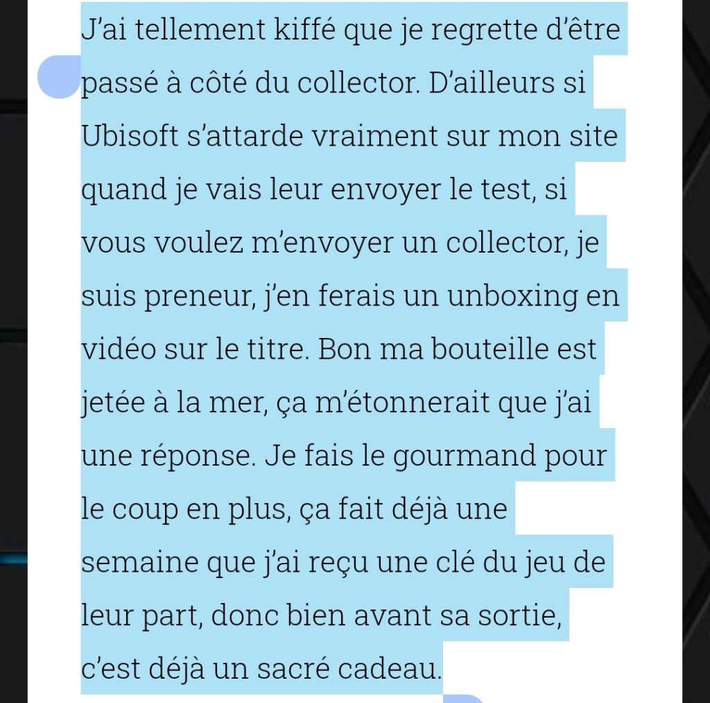 Mais je n’ai jamais pensé qu’Ubisoft allait vraiment lire mon test. À chaque fois, bêtement, je pensais que les RP descendaient jusqu’à la note et puis c’est tout. Jamais je me suis dit qu’ils allaient lire mes pavés. Donc après avoir envoyé mon test à Ubisoft par mail, comme je fais à chaque fois.