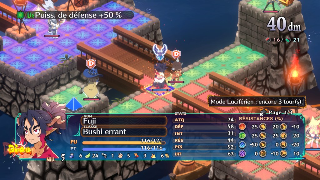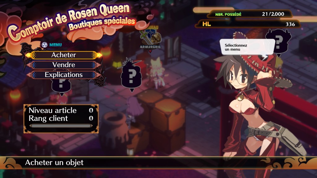 Chaque chapitre est composé de plusieurs sous-chapitre dévoilant à chaque fois de nouveaux pans de l’histoire. Il y a également à chaque phase d’action, des défis qui vous sont proposés comme d’invoquer seulement trois combattants ou bien de n’utiliser que la magie, ou certains types d’armes par exemple. Bien évidemment ces fameux défis ne sont pas obligatoires et vous pourrez passer outre. Ils ne sont là que pour pimenter un peu les choses et vous octroyer quelques bonus supplémentaires. Dans tous les cas, chaque combat sera une vraie planification de vos actions. Car dans Disgaea, il faut minutieusement préparer son offensive. Il faut sélectionner chaque combattant et lui indiquer quelle action vous voulez lui faire accomplir. Ensuite un fois fait vous pouvez valider et passer à votre prochain personnage. Bien évidemment il ne suffira pas de rentrer dans le tas et d’envoyer votre équipe au casse-pipe. Il faudra choisir judicieusement quelle capacité utiliser contre tel ou tel ennemi. Alors oui cela peut paraître fastidieux mais c’est comme cela que cela fonctionne dans un RPG Tactique. De nombreuses actions sont possibles comme avancer, attaquer, défendre, projeter un allié ou un ennemi d’ailleurs, utiliser des items, et j’en passe et des meilleurs. Bref vous l’aurez compris, le panel est très large et vous promet des parties sous hautes tensions. Je vous l’accorde ce n’est pas fait pour tout le monde. Si vous n’êtes pas un minimum patient, passez votre chemin sur le champ. Quand vous ne serez pas en mission, vous pourrez vous promener sur le navire de Pirilika, véritable mastodonte luxueux aussi grand qu’un Sous-Monde, et qui sert de hub. Dans ce lieu, vous pourrez parler à vos compagnons, vous soigner ou acheter des armes. Je vous conseille donc de faire le tour de ces différents endroits entre chaque missions, histoire de reprendre vos forces et d’améliorer au mieux votre équipement.