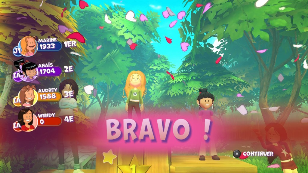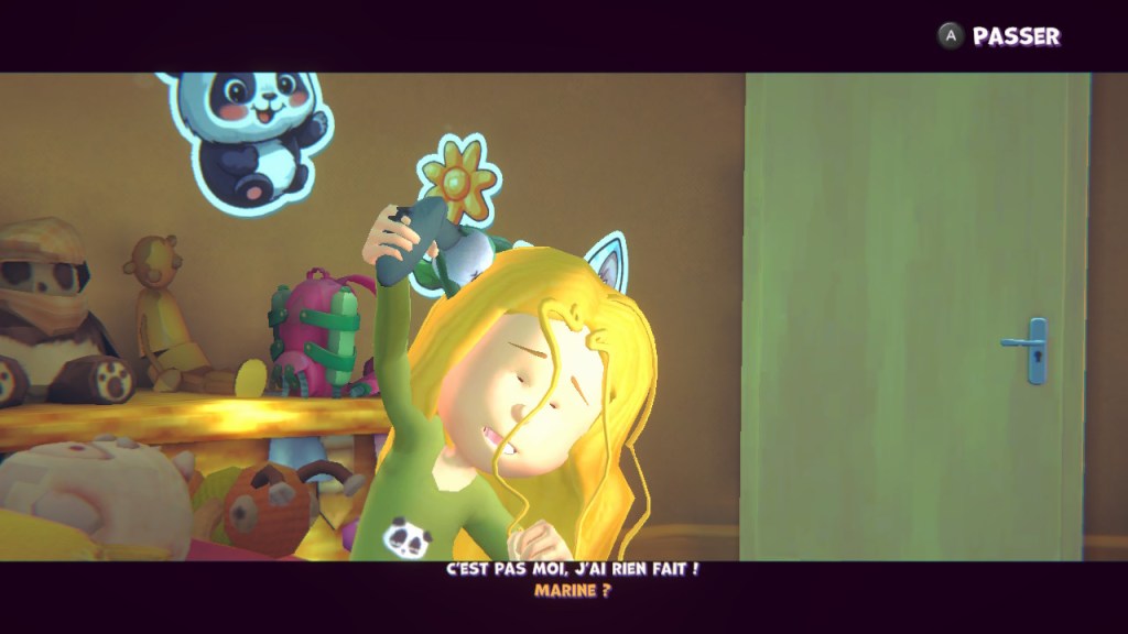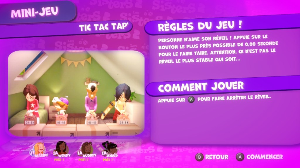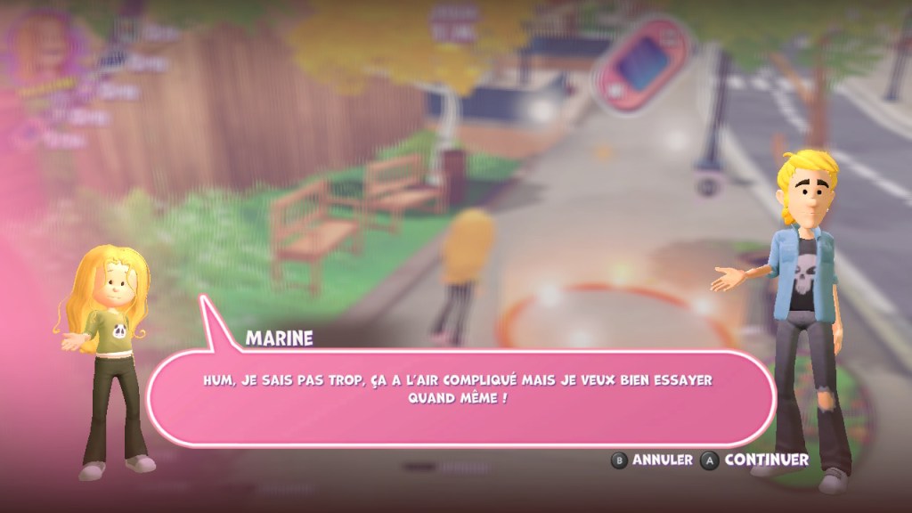 Le jeu débute avec une sélection de personnage. Vous avez le choix entre Wendy et Marine. Pour ma partie, j’ai décidé de choisir Marine ( Jeanne Au secours ! ). Une intro se lance, histoire d’introduire le scénario. En gros, ça raconte que les deux soeurs reçoivent comme cadeau de leur père une tablette et elles rêvent d’être influenceuse et percer sur l’équivalent de Tiktok. Bref, un scénario assez minable et qui à mes yeux donne un mauvais exemple à la jeunesse. Personnellement, je préfère que les enfants fassent des études et deviennent médecins ou avocats grâce à leur cerveau et pas millionnaire parce qu’ils font les cruches devant leur téléphone. Mais bon, on est dans la génération du néant, où on se permet d’appeler ça des stars alors qu’ils ne font rien d’exceptionnel.