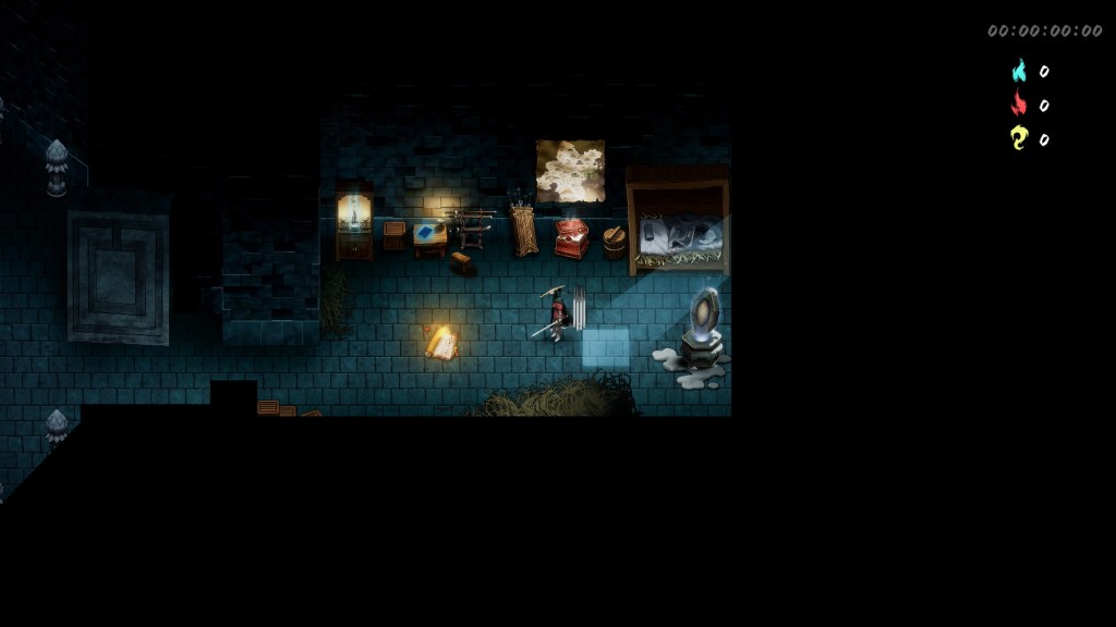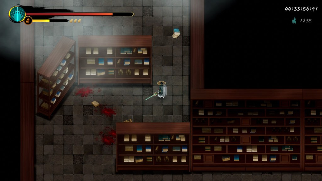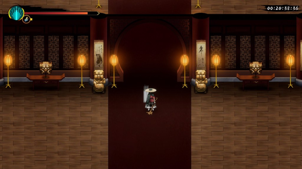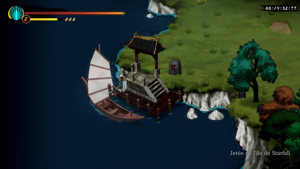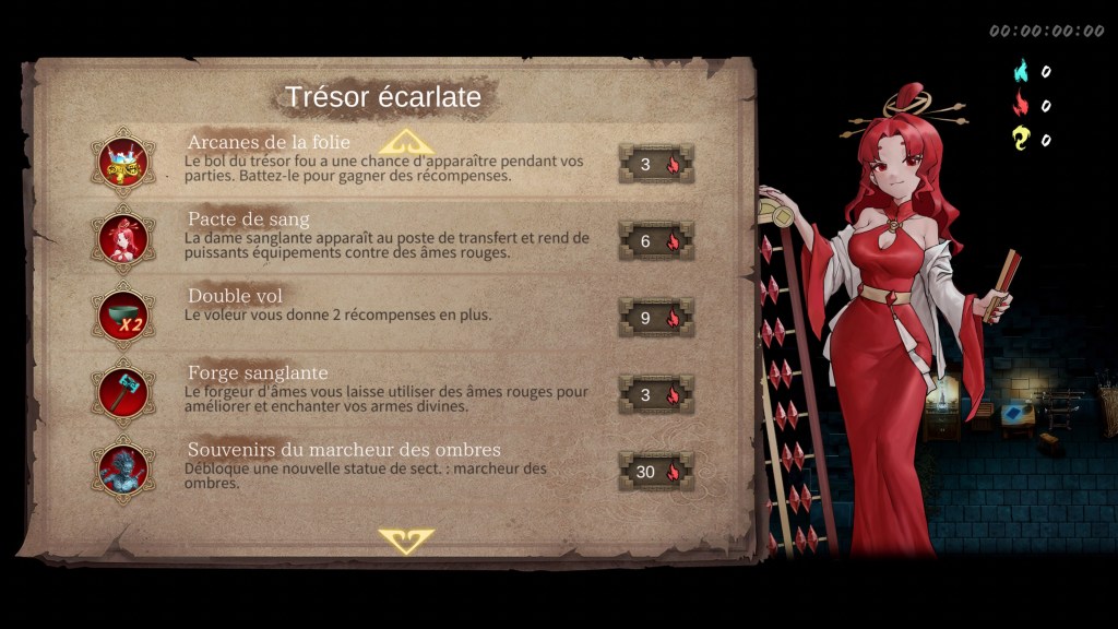 On va donc commencer par le plus important dans ce genre de jeu, il s’agit d’un Die & Retry, j’ai nommé le gameplay. Il est d’une fluidité à toutes épreuves et ça c’est hyper agréable. On peut enchaîner les attaques au sabre suivi d’un lancé d’épées sans problème. Il existe une multitude d’aptitudes qui vous permettront d’enrichir votre style de combat et ainsi venir à bout avec classe des différents ennemis. Vous pourrez également adjoindre des effets élémentaires à vos armes qui seront dévastateurs, du moins si vous avez la chance d’y associer une capacité compatible. Car oui, dans ce jeu il faudra aussi beaucoup compter sur la chance. Car après chaque run, après chaque mort, vous reviendrez inlassablement à votre point de départ et vous perdrez par la même occasion l’ensemble des capacités et armes que vous auriez pu trouver. En vrai, je vous l’accorde c’est hyper frustrant et totalement injuste, mais comme on dit c’est le jeu ma pauvre Lucette… Les Die & Retry comme on les surnomme souvent sont extrêmement punitifs et exigeants. Mais lorsque l’on parvient à nos fins et que l’on surmonte la difficulté, c’est tellement gratifiant d’y arriver ! Mais pas de panique, quand je dis que vous allez tout perdre, ce n’est pas tout à fait vrai, vous obtiendrez en échange de tout ça, une quantité variable, en fonction de votre avancée dans le jeu. Un cristal rouge vous permettra de débloquer pour de bon vos statistiques. Une barre de vie plus grande, une attaque plus puissante, des soins plus efficaces, ect… Vous voyez c’est pas si difficile que ça ? Si ? Plus vous avancer dans le jeu et plus les possibilités de customisation de votre équipement sera riche. Au fur et à mesure que vous vaincrez les Boss, vos choix d’optimisation seront plus nombreux. Les aficionados du genre auront de quoi satisfaire leurs appétits. Il faudra également à tout moment faire des choix, que se soit au début dans le temple pour prier la divinité qui vous accordera sa bénédiction ainsi que tout au long de votre périple pour choisir votre chemin. Car la vie n’est pas un long fleuve tranquille et chaque décision que vous prendrez sera bonne ou mauvaise mais ça vous ne le saurez qu’une fois qu’il sera trop tard.