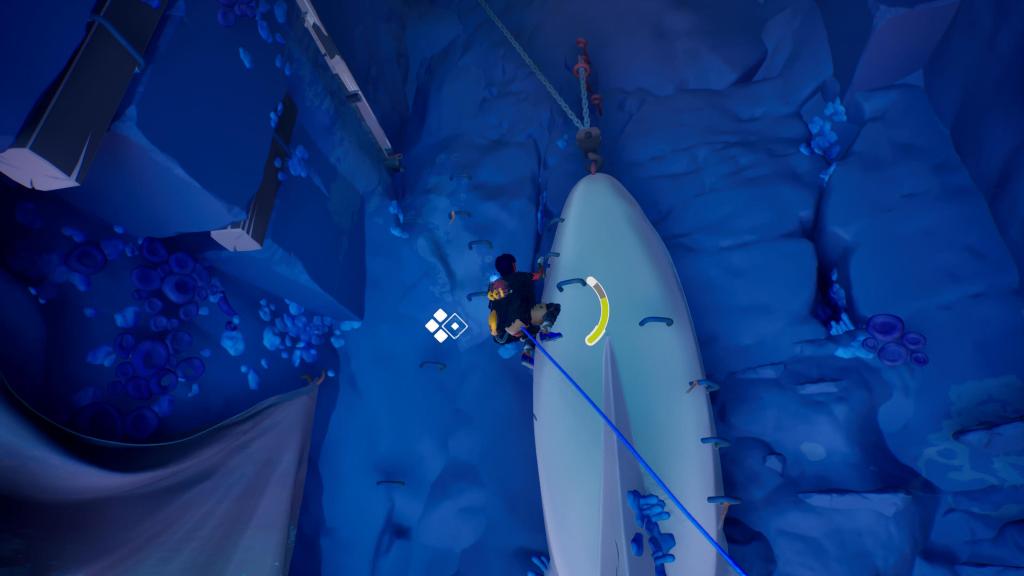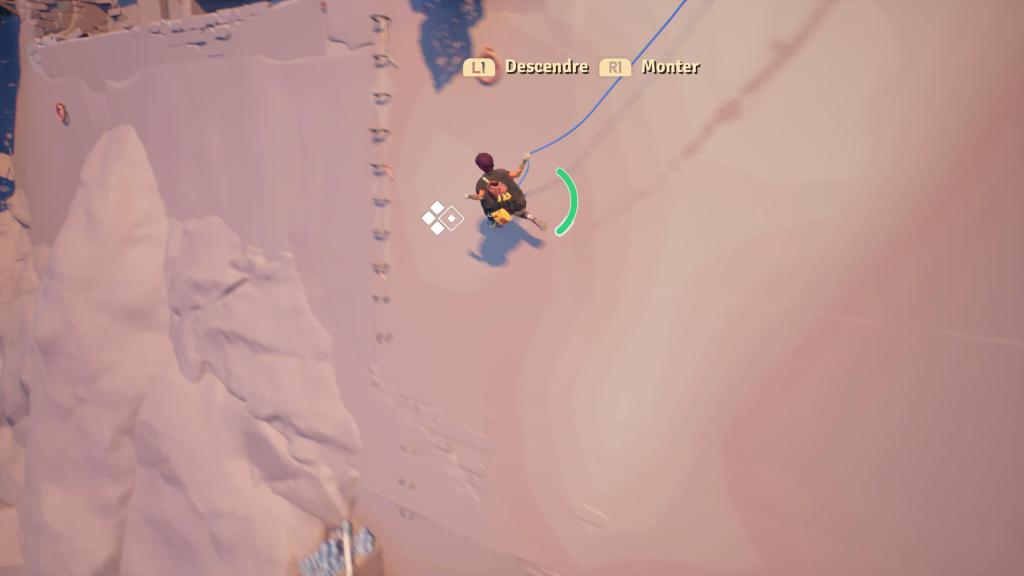 La chose principale du jeu, c’est son gameplay et j’ai trouvé que ça avait des similitudes avec Death Stranding. Pendant l’escalade, la main gauche de notre héros est gérée par la gâchette L2 tandis que sa main droite est prise en charge par la gâchette R2. Pour éviter de se casser la gueule, on a la possibilité d’utiliser 4 pitons, ce qui permet de un de reposer notre héros et donc, lui permettre de régénérer un peu sa stamina et de deux, ça évite de tomber et de repartir de plus bas. D’ailleurs avec ses pitons, il sera possible de se balancer avec la corde de gauche à droite mais aussi descendre et monter avec les touches L1 et R1. Oui car notre héros à une barre de stamina qui baisse quand on effectue des sauts. Même si le gameplay semble technique, le jeu n’est pas très difficile. Le gameover n’existe pas, mais malgré ça, on ne ressent pas une routine dans le jeu car il faut analyser la montée, on s’ennuie donc jamais. Certes un chemin principal est légèrement tracé, mais on a plusieurs façons de grimper. Il faudra réfléchir pendant la montée et utiliser la bonne façon que vous préférez pour monter.