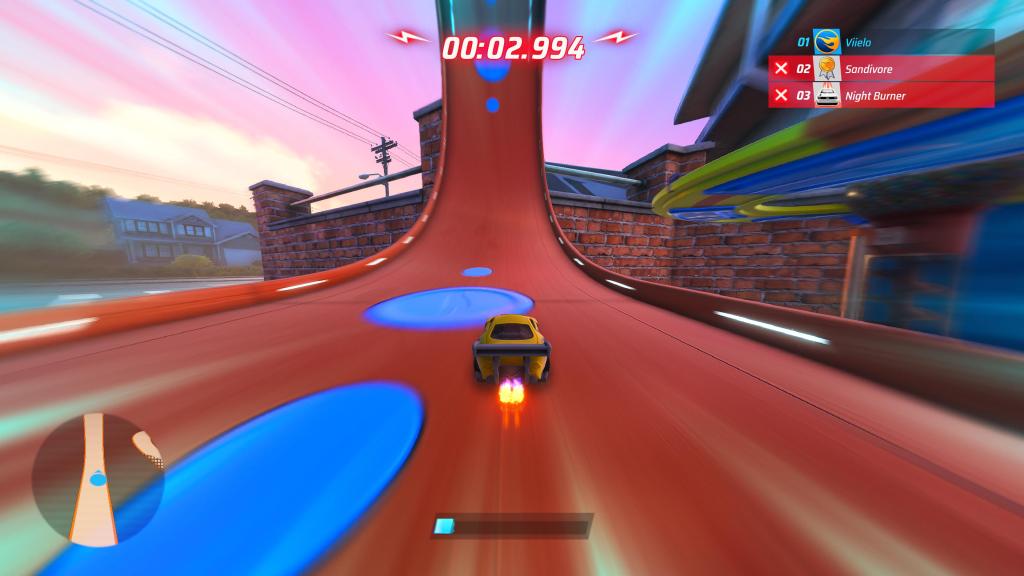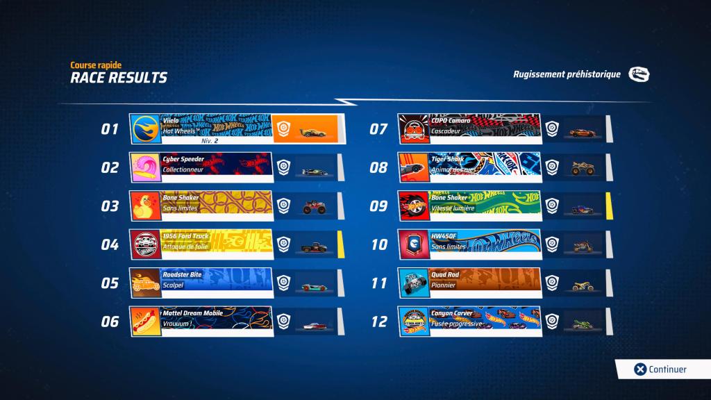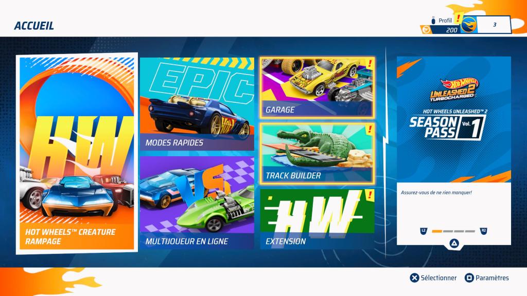 Hot Wheels, on connaît tous, c’est la marque des petites voitures pour les enfants. Hot Wheels Unleashed est donc une licence de courses de petites voitures. Alors on pourrait croire que c’est pour les gosses, mais le gameplay est plutôt technique et il y a différents modes de difficulté. On est donc sur un jeu de course avec différents modes de jeu, on a le mode « Hot Wheels créature Rampage », c’est donc le mode histoire, puis on a le mode « Course rapide », pour ceux qui veulent faire juste une course direct, on a un multijoueur en ligne mais aussi en écran splitté et ça c’est cool. On a toujours le mode Track Builder qui permet de créer son circuit et le partager à la communauté et on a le garage où on a toutes nos voitures et la possibilité d’en débloquer avec l’argent du jeu mais aussi avec votre carte bleue. Il y a déjà une grosse multitude de DLC qui ont été annoncés, tout comme pour le premier épisode. Vous pouvez modifier votre véhicule favoris, une grosse customisation avec un arbre de compétence est présent.
