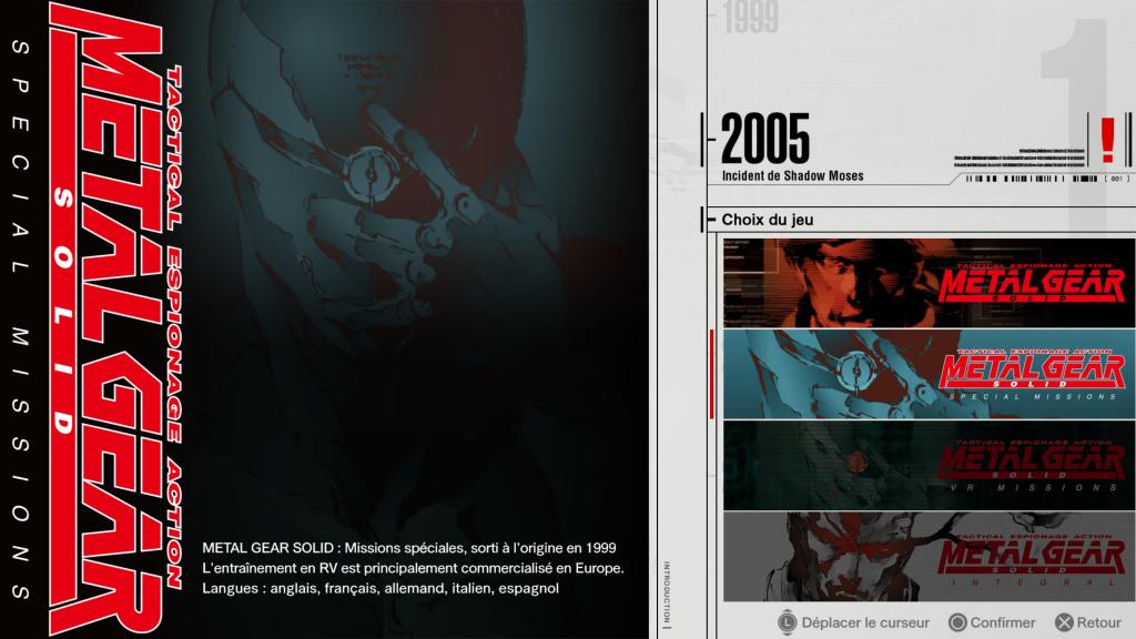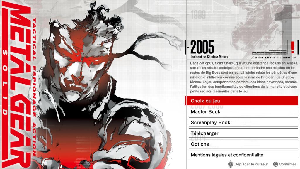 Pour commencer sur cette compile, vous allez retrouver cinq jeux. Ne vous attendez pas à tous les Metal Gear Solid, forcément ce serait trop facile, il faut bien que Konami se fasse du pognon. Les jeux se trouvant sur cette compile sont Metal Gear, Metal Gear Solid Snake, Metal Gear Solid, Metal Gear Solid 2 et Metal Gear Solid 3. Je vais être clair, je n’ai pas lancé les 2 premiers, je les ai fait à l’époque et forcément, ce n’est pas parce que ça tourne sur PS5 que ça va changer quoique ce soit. J’ai donc commencé cette compile avec Metal Gear Solid premier du nom, que je n’avais pas fait depuis des années. Et pour la petite histoire, c’est mon jeu de coeur, c’est celui que j’ai le plus terminé dans ma vie, avant de le terminer de nouveau avec cette compile, je l’avais déjà terminé 97 fois. Vous connaissez, quand on est enfant, on n’a pas forcément les moyens d’acheter énormément de jeu. Donc même si j’ai plutôt été gâté durant mon enfance, je revenais sans cesse sur Metal Gear Solid. Et même quand j’avais la PS2, je jouais encore à Metal Gear Solid attendant que la suite arrive.