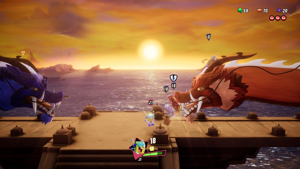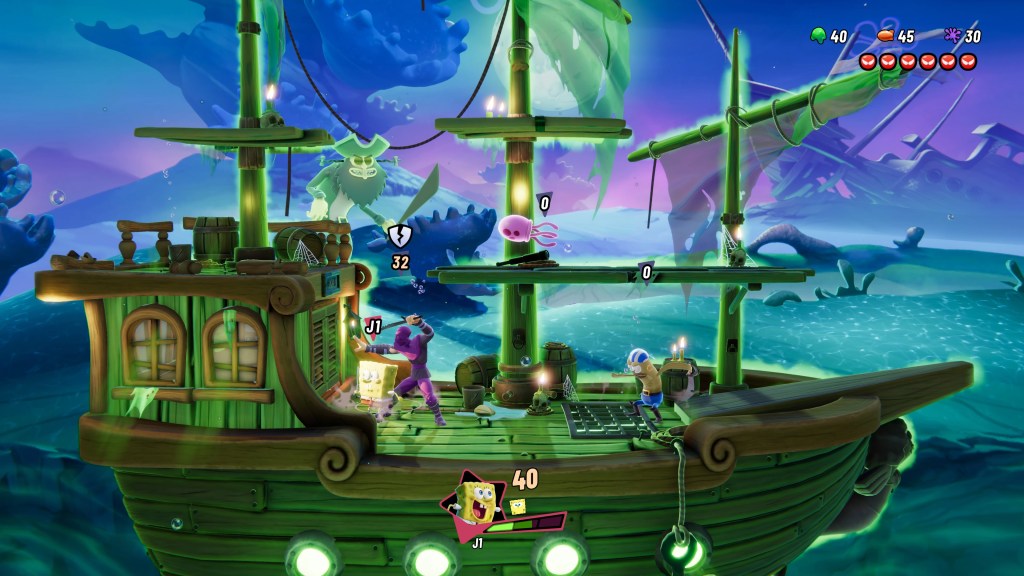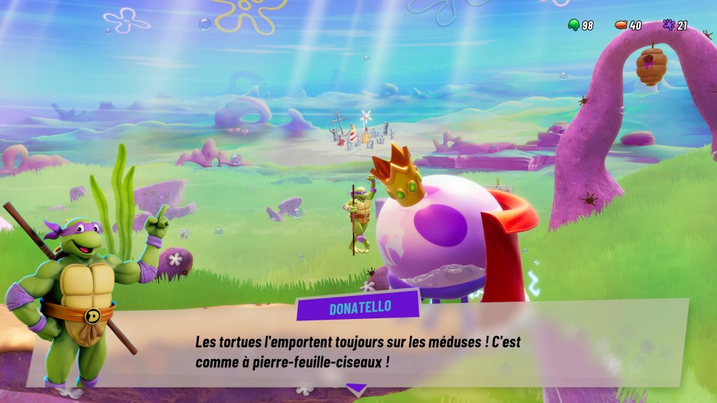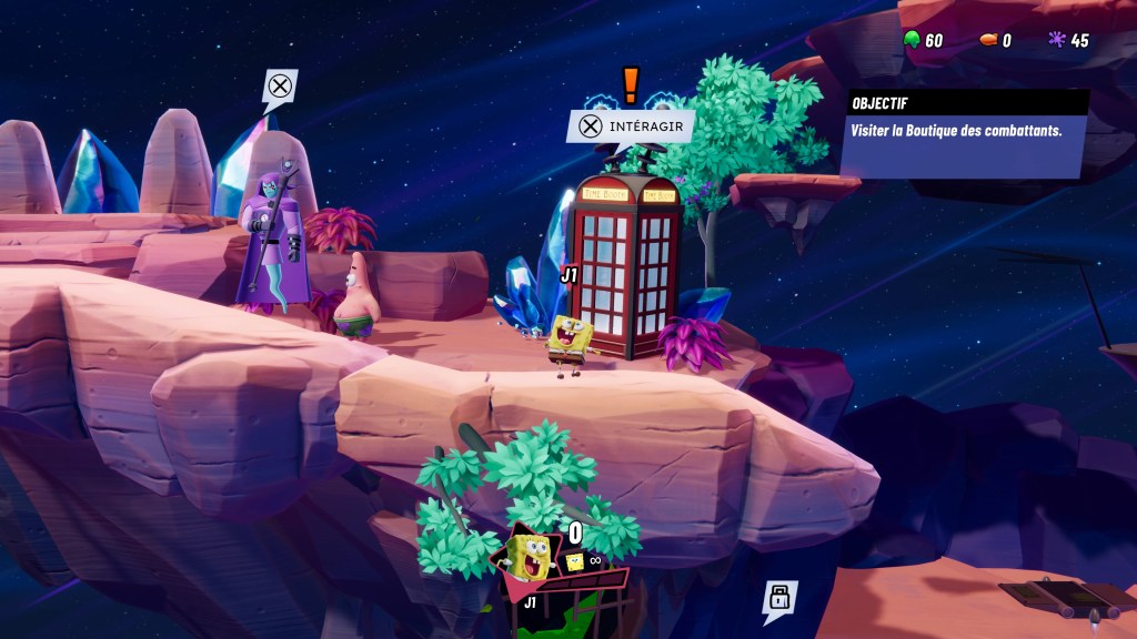 En plus des modes de jeu habituels, arcade, versus et en ligne, il y a également un mode campagne assez intéressant. On y incarne au départ l’intrépide Bob l’éponge qui doit aller secourir son ami Patrick qui vient de se faire aspirer dans un étrange trou noir. Sans vous spoiler, on finira par rapidement atterrir dans une zone qui servira de hub pour le reste de notre aventure. On y rencontrera quelques PNJ qui nous permettront de nous entraîner, d’améliorer notre équipement, changer de personnage ect. La base quoi ! Une fois que l’on a tout choisi, on peut lancer une partie, on naviguera sur une sorte de timeline avec différents embranchements, selon la route choisie, des défis différents vous seront proposés. J’ai trouvé que c’était une bonne idée, cela permet de briser la monotonie d’une quête linéaire. C’est de cette façon également que l’on pourra débloquer de nouveaux personnages jouables dans ce mode aventure. Enfin il faudra bien évidemment réussir à les vaincre une fois avant de pouvoir les compter parmi nos alliés. On progresse donc de défis en défis jusqu’à atteindre le boss de la zone. Une fois vaincu, on passe à la suivante. Et si par malheur vous deviez mourrir et bien retour à la case départ après une petite vidéo « Rewind » retour rapide, à la façon cassette vidéo que les plus jeunes d’entres nous n’ont jamais connu… Au fur et à mesure de notre avancement, on gagne des jetons que l’on pourra dépenser auprès des PNJ dans le hub. Histoire d’obtenir de nouvelles capacités ou d’augmenter nos emplacements par exemple. Il y a également un mode entraînement, des mini-jeux ainsi qu’un mode Boss où il faudra enchaîner les méchants pas beaux à la chaîne. Bref de quoi bien se défouler en rentrant à la maison le soir après une dure journée de labeur.