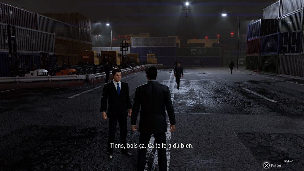 Alors oui je sais, vous êtes déjà comblés et je ne vous ai pas encore parlé du jeu en lui-même. Rendez-vous compte qu’en plus de tout ça, il va falloir s’occuper de l’histoire principale quand même. Bah ouais c’est pour cela que vous avez commencé à lire mon article, non ? Revenons à nos moutons, et concentrons nous sur notre périple qui va nous mener aux quatre coins de la ville pour effectuer diverses missions. Lors de vos déplacements dans la ville, vous serez très souvent aux prises avec des bandes de loubards qui vous chercherons des crosses. Vous pourrez bien évidemment les éviter mais sachez qu’a chaque combat, vous recevrez de l’argent et comme vous le savez déjà, dans notre monde capitaliste, il est très important. Il vous permettra non seulement de vous offrir divers équipements dans les boutiques comme des armes, des armures, des vêtements et autres accessoires. Mais il vous sera aussi indispensable pour améliorer vos aptitudes. Elles sont subdivisées en quatre catégories, Statistiques, Aptitudes partagées, Agent et Yakuza. Et plus vous les améliorerez et plus elles seront chères. Alors si je peux vous donner un conseil, n’hésitez pas à faire un maximum de combats de rue qui sont ma foi relativement faciles et qui rapportent plutôt bien. N’hésitez surtout pas également à fouiner un peu partout pour trouver des malettes renfermant des objets sympa et qui peuvent se revendre chez le prêteur sur gages. Un sou est un sou et tout est bon à prendre.