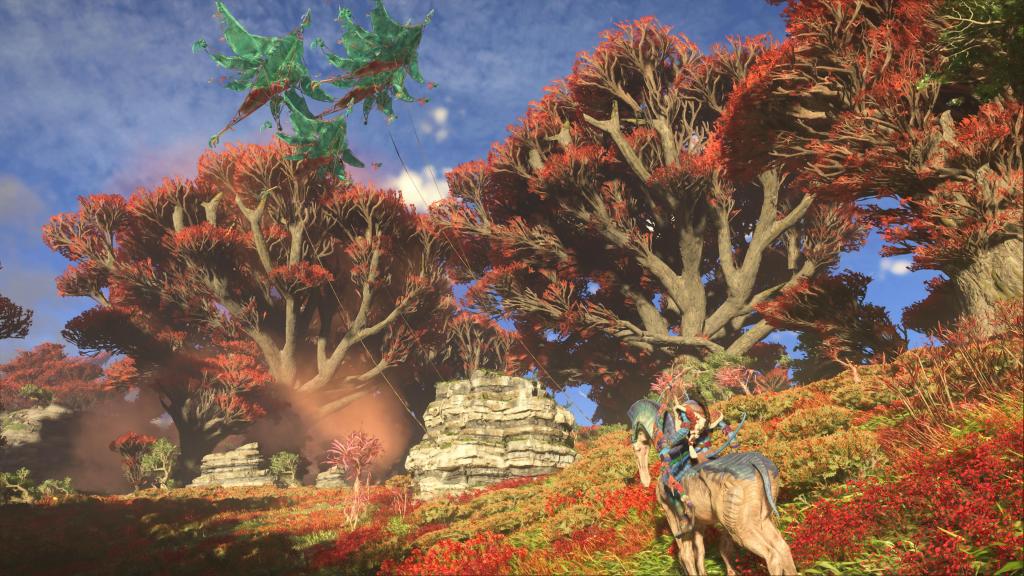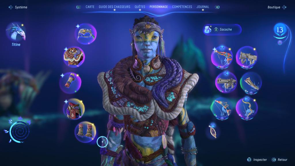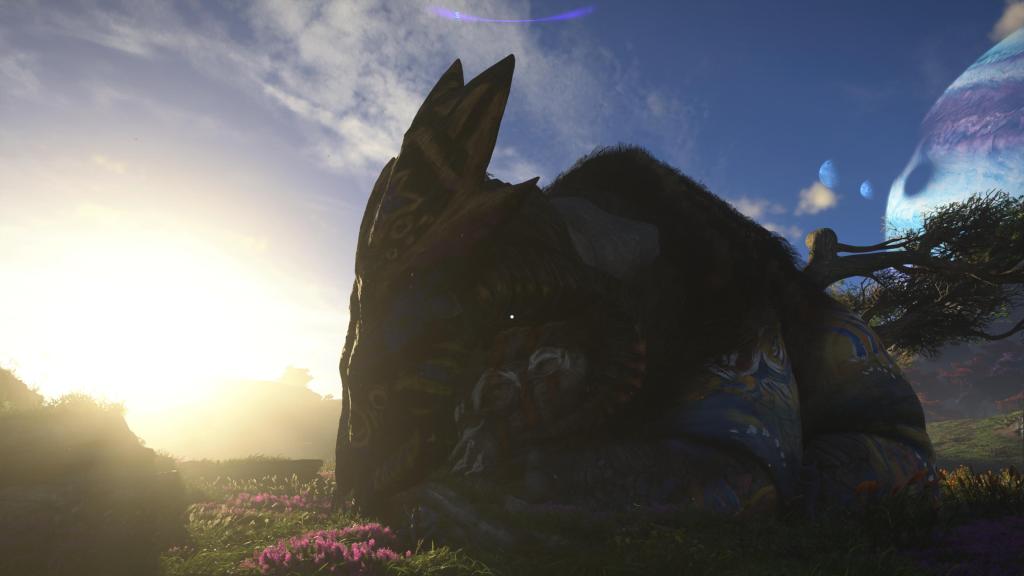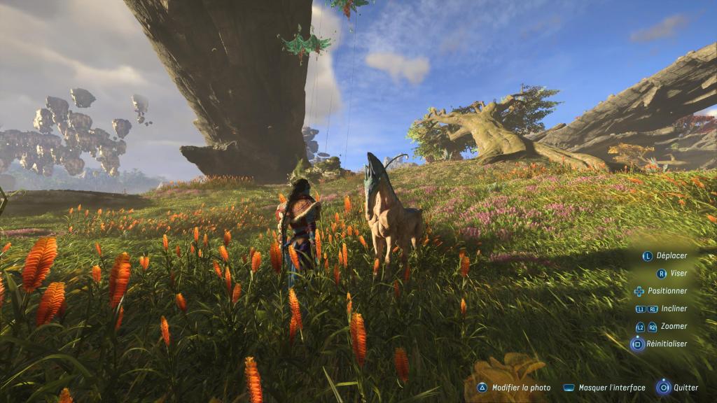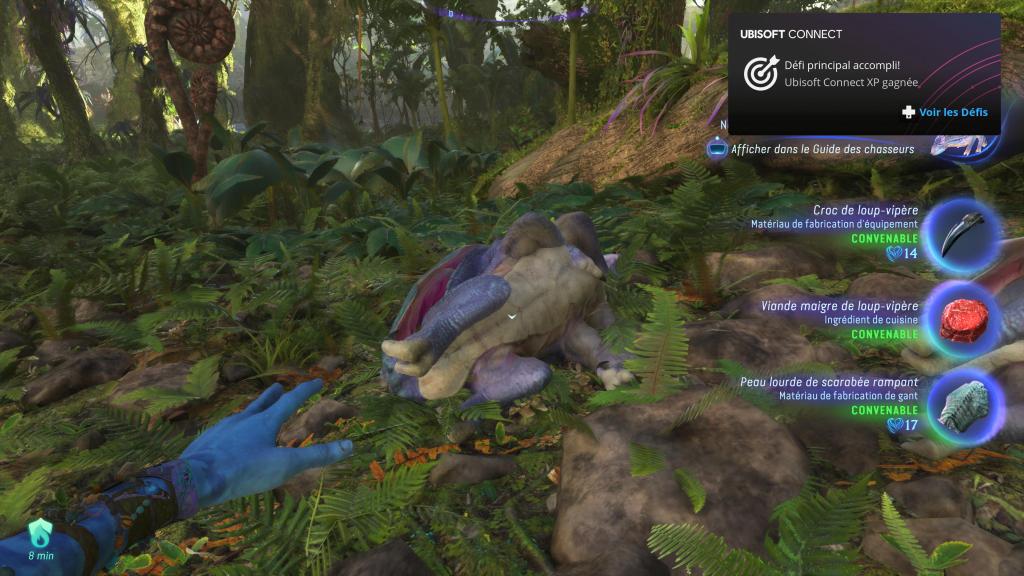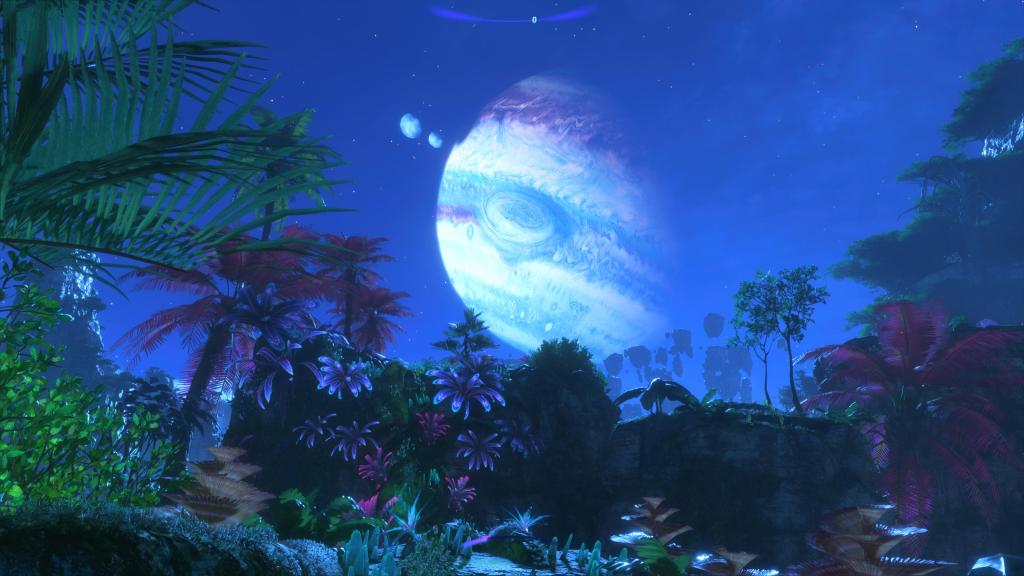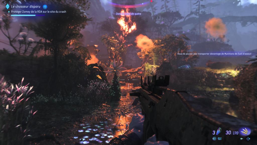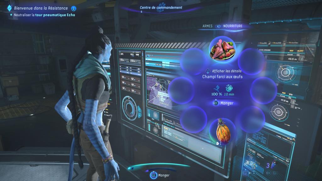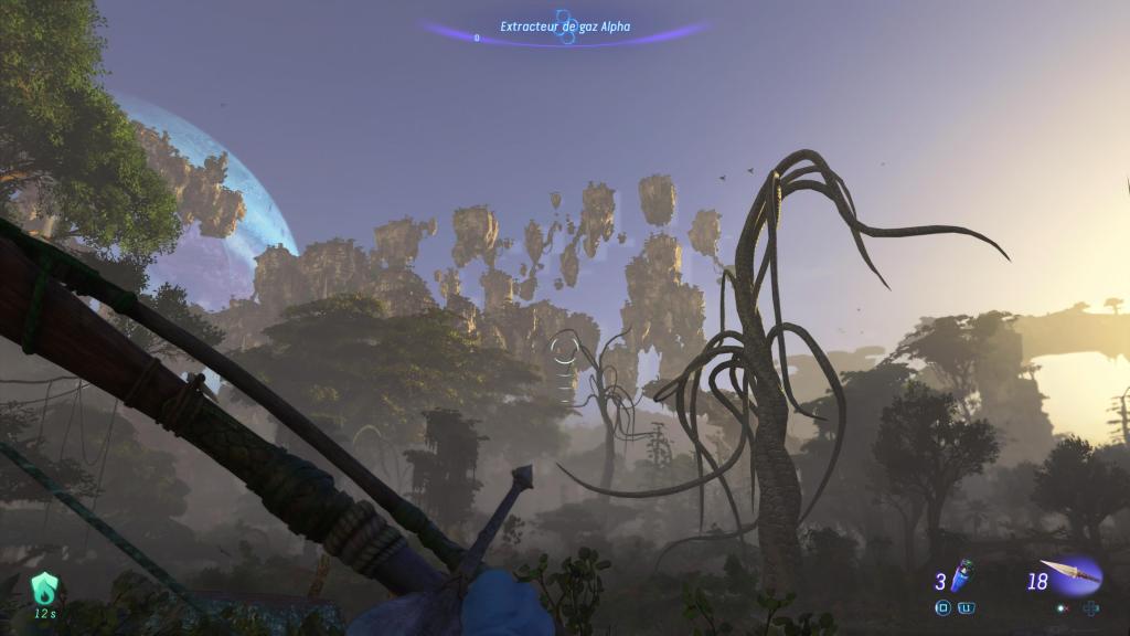 Concernant le gameplay, on prend les bases de Far Cry et on y rajoute de la verticalité. Ceux qui vous diront le contraire, vous mentiront. J’ai fait tous les Far Cry, donc je suis bien placé pour le savoir. Le jeu Avatar Frontiers of Pandora est tout simplement un jeu Far Cry avec une skin Avatar. Alors oui, la verticalité apporte énormément pendant les affrontements. Mais toutes les missions, le cheminement du scénario, le gameplay, tout est repris de Far Cry. Les seuls choses rajoutées sont concernant la cueillette des fruits et la chasse. Si vous cueillez bien un fruit, il sera de meilleure qualité et si vous tuez plus proprement un animal, la viande sera de meilleure qualité. Et outre la verticalité que propose le gameplay dû au fait qu’on contrôle un géant bleu, le jeu pompe énormément la recette de Far Cry. La seule nouveauté vraiment importante qu’Ubisoft a osé proposer, c’est l’exploration. Au départ du jeu, on vous demandera si vous souhaitez une aventure guidée ou une aventure tournée vers l’exploration. Et c’est cool car ça nous oblige à explorer le monde. On vous donnera quelques détails pour trouver le lieu, du genre « il est derrière une montagne à l’ouest « , mais le chemin ne sera pas délimité, ce sera à vous de vous y rendre et surtout de chercher comment y aller. C’est clairement le gros point positif du titre. Mais le soucis, c’est que ce point est gâché par des missions principales ennuyantes et surtout répétitives. Donc le scénario est basique, les missions principales sont chiantes et les missions secondaires sentent le remplissage.