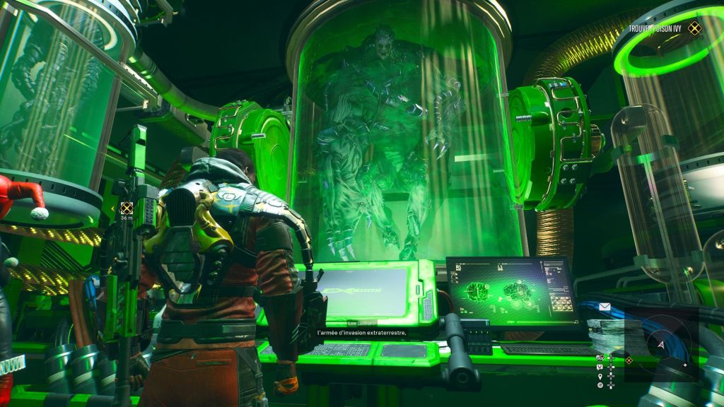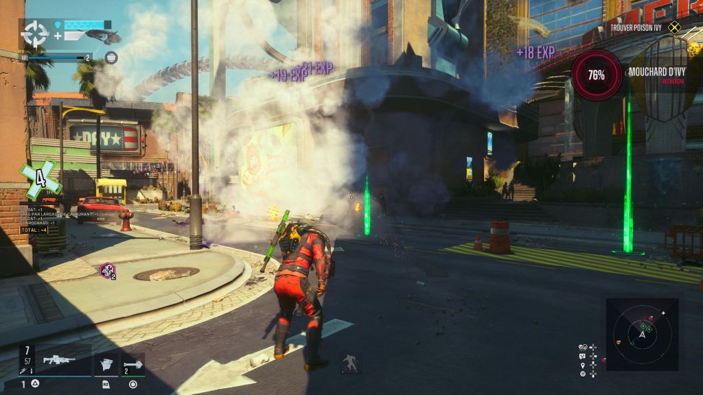 Concernant le gameplay, on est vraiment sur du très basique et assez répétitif. En solo, vous avez la possibilité de jongler entre les personnages à la volet et sans chargement, mais malgré ça, le gameplay est très répétitif. Étant donné que les personnages ont juste de différent leur manière de se balader sur le map. Par exemple, Captain Boomerang utilise la Super vitesse de Flash, Deadshot utilise un jetpack etc. Sinon vous avez deux types de tir, un puissant et un normal et avec le temps vous débloquerez un super-coup et un gros coup final qui lancera une animation. Bref rien de très neuf en terme de gameplay, c’est du vu et du revu.. On se retrouve sans cesse à faire des missions vraiment nulles. Outre les combats de Boss qui cassent un peu l’ennui, on se retrouve sans cesse à faire les mêmes choses et à tuer des vagues ennemis qui se ressemblent toutes. De plus, les Gun-fights sont souvent très brouillons et on perd assez rapidement en visibilité. Surtout qu’au final, les ennemis sont juste des gros sacs à PV, pour faire grimper votre personnage, histoire de débloquer quelques techniques dans l’arbre de compétences. D’ailleurs sachez que si vous souhaitez faire évoluer tous les personnages, vous êtes obligé de jongler entre tous, seul le personnage que vous contrôlez voit son niveau augmenter. J’ai trouvé ça un poil stupide, ça force de devoir sans cesse tourner entre tous les héros car sinon seul votre personnage que vous jouez aura un niveau important. Et donc dans les Gun-fights les autres toucheront à peine les ennemis… Après ça, c’est si vous jouez en solo, forcément en multi, chacun fera évoluer son personnage sélectionné. D’ailleurs à chaque fin de mission, vous débloquerez une nouvelle arme, encore une fois, c’est du déjà vu dans d’autres titres du genre.