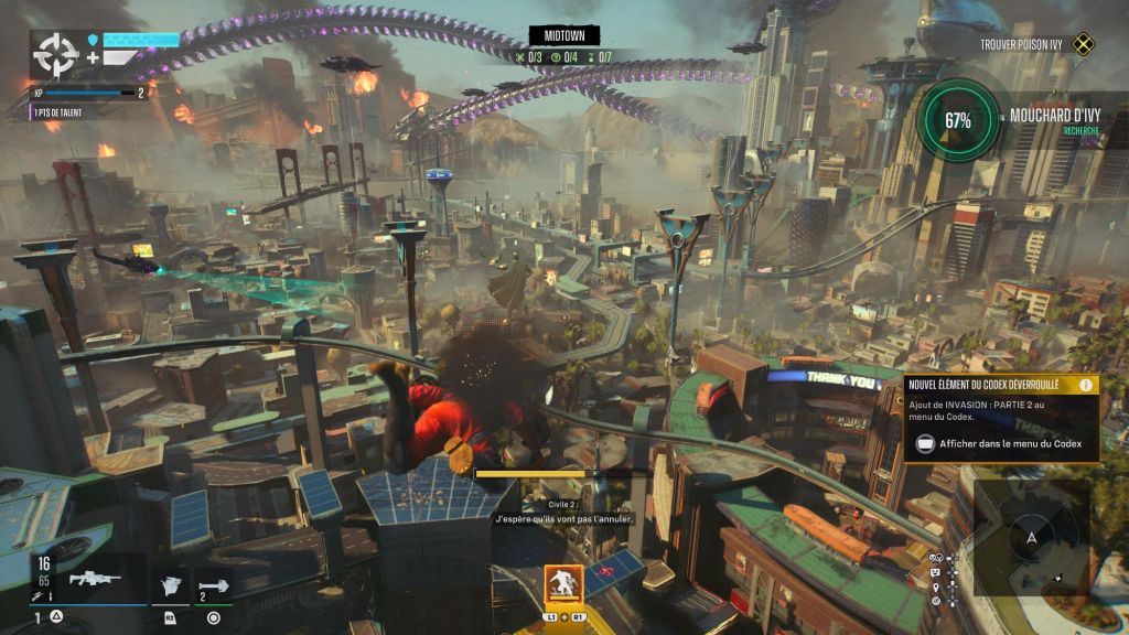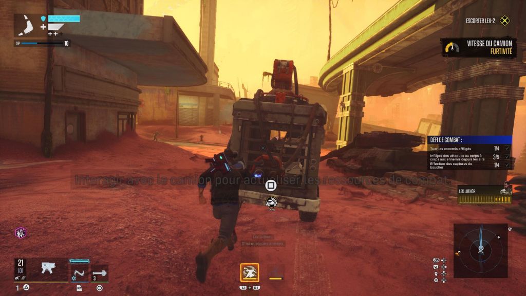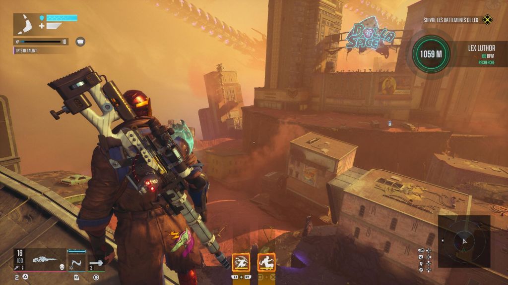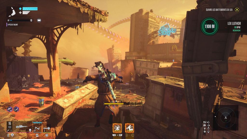 Les graphismes présentent des hauts et des bas. Certains éléments visuels sont assez jolis, mais parfois les textures sont inégales. Les personnages sont bien modélisés, mais l’environnement aurait pu bénéficier de plus de soin. Alors oui, Metropolis a été détruite, le scénario aide beaucoup a camouflé un manque d’ambition des développeurs, car la ville est totalement morte et vide. On a aucun PNJ, rien du tout, on se balade dans une grande ville qu’avec des bâtiments et tout est mort. Alors oui, c’est le scénario patipatata, mais je suis désolé, ils auraient pu mettre certains survivants qui essaient de se cacher, histoire d’avoir une ville tout de même un poil vivante. J’ai l’impression de revoir Batman Arkham Knight qui avait un Gotham du même acabit que le Metropolis de ce jeu. À côté de ça, le jeu tourne comme une horloge, j’ai rencontré aucune baisse de framerate dans mes 15 heures de jeu.