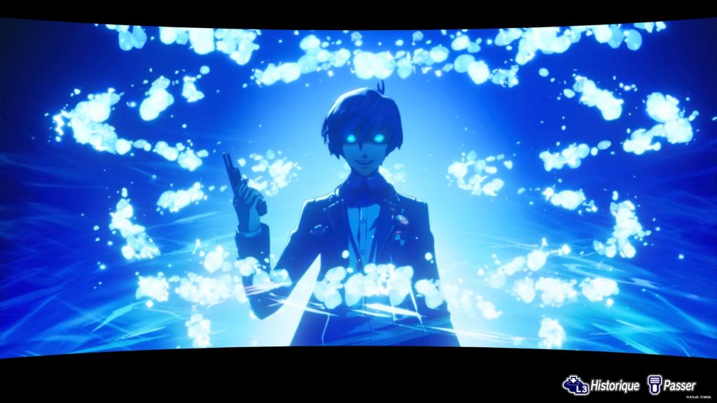 Très tôt dans l’histoire vous allez être confronté à cette réalité et devoir y faire face. Car vous êtes parmi les rares personnes à ne pas être affecté par cette situation. Vous allez donc intégrer les SEES (Section d’exécution Extrascolaire Spécialisée). Une équipe hétéroclite d’élèves qui combat les ombres en invoquant des Personaes, sorte de monstres surpuissants liés à leurs porteurs. On les retrouvent d’ailleurs dans tous les jeux de la saga. La façon de les invoquer par contre est très différente dans ce jeu puisque les protagonistes doivent se coller un pistolet sur la tête et presser la détente pour faire apparaître lesdites invocations. Un procédé vraiment controversé qui je trouve n’a pas vocation à apparaître dans un jeu vidéo. Ce côté provocateur qui montre clairement le suicide de jeunes gens est très discutable. Il avait d’ailleurs fait énormément polémique au Japon lors de sa sortie à l’époque du jeu d’origine en 2006. C’est un point qui pousse une nouvelle fois l’aspect horrifique du titre. Même si je dois bien l’avouer, graphiquement parlant on est jamais dans des couleurs sombres, au contraire la couleur dominante de ce Persona 3 est le bleu. Chaque jeu à d’ailleurs sa propre couleur dédiée pour le 4 c’est le jaune et le 5 le rouge.