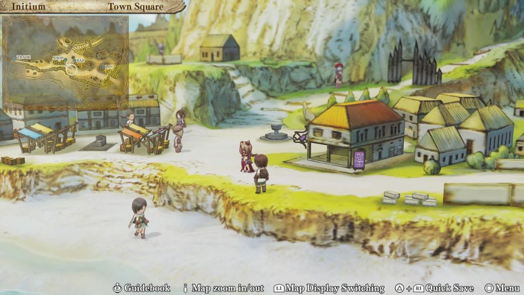 Nous démarrons donc notre aventure à Initium, point de départ des aventuriers en herbe et seule ville humaine de l’île. Il servira de Hub central, c’est ici que vous pourrez acheter divers équipements et autres potions de soins, on y retrouve également la taverne pour reprendre des forces et un hôtel pour se reposer. Après avoir choisi votre héros parmi une sélection de 7 personnages. Chaque protagoniste possède ses propres spécificités, à vous de choisir. Il y a donc Meurs, oui je sais c’est assez étonnant comme prénom, le guerrier élémentaliste, Garnet, une chevalière templier, la mystérieuse Bianca qui est amnésique, Liber, le chasseur de trésors, Éloïse, la pulpeuse alchimiste, Owen le mercenaire et pour finir Filmia le Prince Grenouille. J’ai pour ma part opté pour la touche glamour qu’apportait Éloïse. De toute façon vous pourrez recruter les autres personnages au cours de votre avancement dans l’aventure.