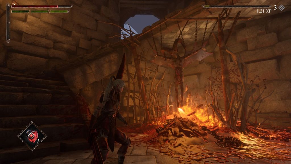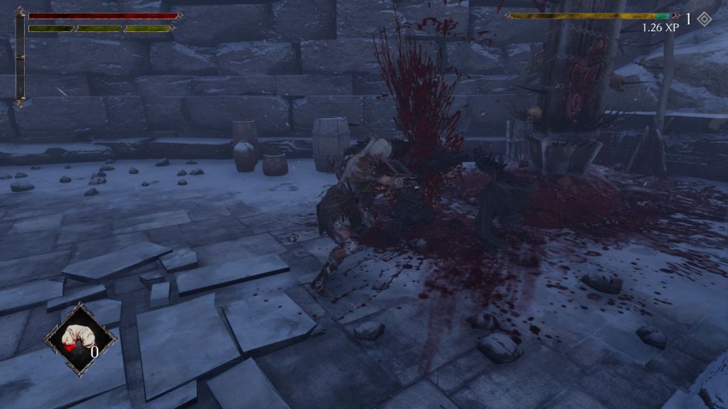 Graphiquement parlant c’est plutôt correct sans être transcendant non plus, je dirais que cela ressemble beaucoup à un Soul-Like. Il faut dire aussi que ce n’est pas un triple AAA et que c’est une petite équipe qui l’a réalisé. Personnellement cela ne me dérange absolument pas. Vous commencez à me connaître, j’aime jouer et découvrir tout types de jeux et d’univers différents. Les différents menus sont assez pauvres et ne donnent pas vraiment envie de s’y attarder. C’est assez rudimentaire mais le principal est là. Mais ce qui frappe le plus et ce dès le début, c’est le sang partout. C’est gore à souhait ! Dès que l’on frappe un ennemi, des gerbes d’hémoglobine jaillissent et souillent l’environnement déjà très malaisant… Un véritable enfer rempli de monstres tous plus horribles les uns que les autres. En un mot c’est cauchemardesque. Après j’ai envie de dire, le jeu annonce d’entrée de jeu la couleur rien qu’avec son titre Morbid The Lords Of Ire ça ne sonne pas vraiment comme la mélodie du bonheur… Alors bien évidemment il n’est pas à mettre entre toutes les mains, surtout les plus jeunes.