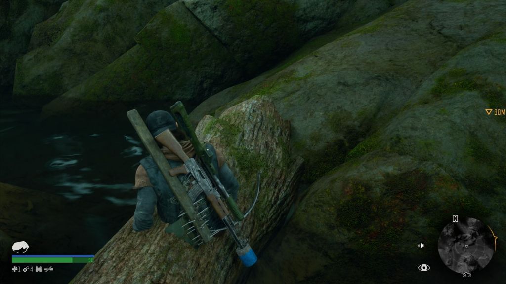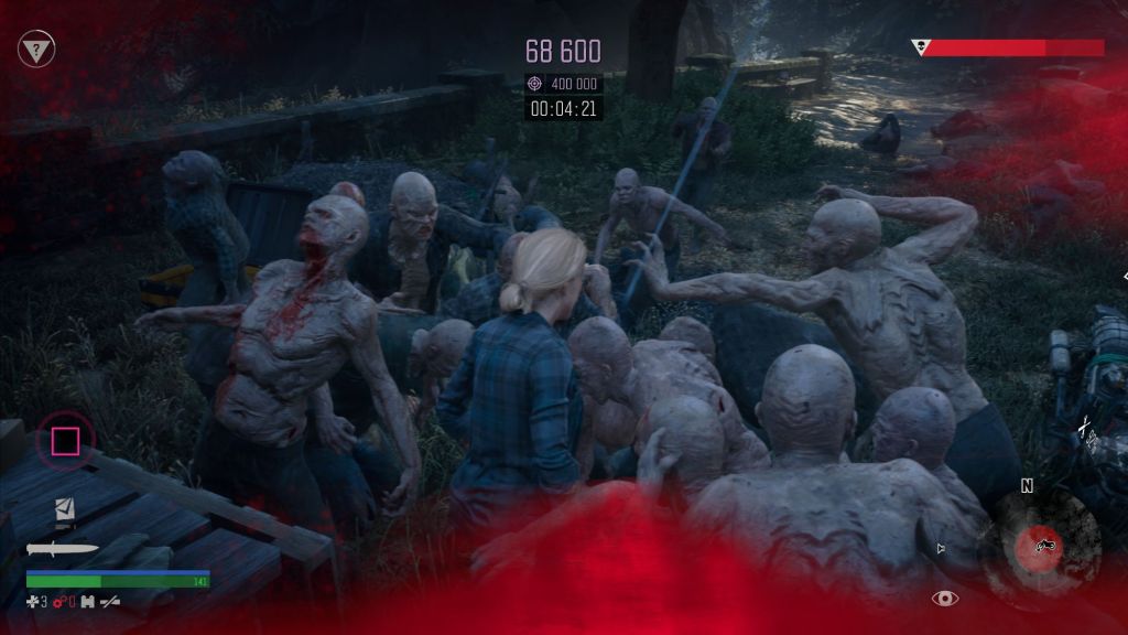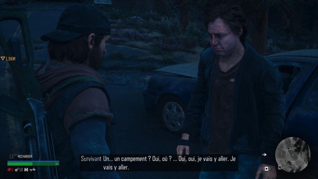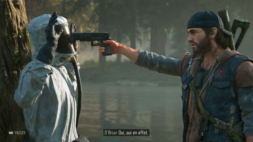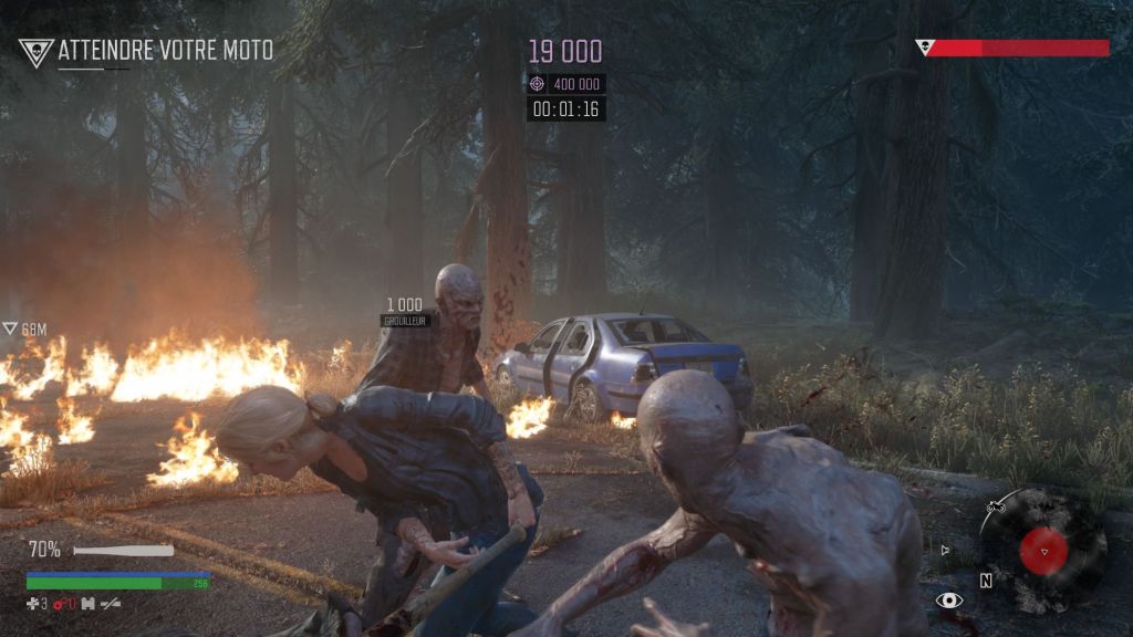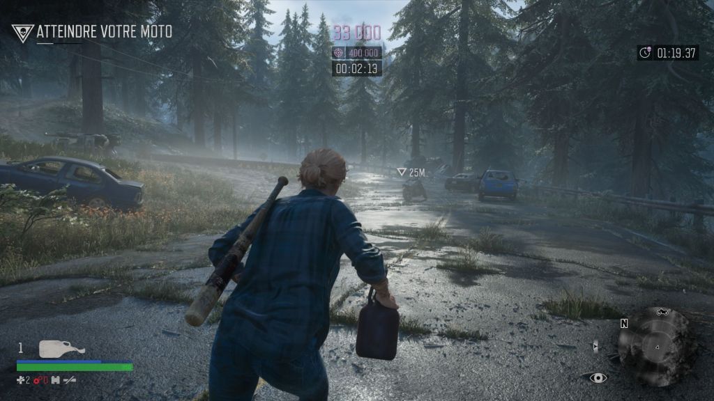 Concernant le gameplay, c’est un mélange entre Uncharted et The Last of us. Le jeu ne révolutionne rien mais il procure de bonnes sensations de plaisir. Les gun-fights sont nerveux, la puissance de feu est présente, que l’on passe d’un fusil à pompe ou d’une mitraillette . La conduite en moto est bonne, même si assez lente en plus du soucis que j’ai cité plus haut. D’ailleurs cette dernière sera un personnage clé dans l’aventure. Il faudra lui remplir le réservoir et la réparer en trouvant des pièces détachées un peu partout sur les véhicules abandonnés. Dans les différents camps, vous aurez la possibilité de la customiser et donc d’avoir un véhicule plus solide et rapide. Autre chose, dans les camps outre le garage à moto et les missions, vous trouverez aussi de quoi vendre des oreilles de zombies pour gagner des primes et en profiter aussi pour revendre des morceaux d’animaux que vous aurez récupéré en chassant. L’argent gagné, vous permettra de soit faire le plein ou une réparation de votre moto, soit acheter des armes, histoire de partir dans ce monde post-apo armé jusqu’aux dents. D’ailleurs il n’y aura pas que les armes à feu, vous pouvez utilisez des armes de mêlées, batte avec des clous, avec une scie, barre de fer etc. Mais aussi des grenades ou cocktails Molotov. En terme de nouveautés, outre que le jeu tourne super bien, on a un nouveau mode intitulé « Assaut de Horde », en gros c’est un mode où on est face à des hordes toujours plus imposantes et où à la finalité, on obtient un score. Rien de folichon, mais c’est à citer tout de même. Ce qui est bien, c’est qu’on peut jouer avec la plupart des personnages qu’on croise dans l’aventure.
