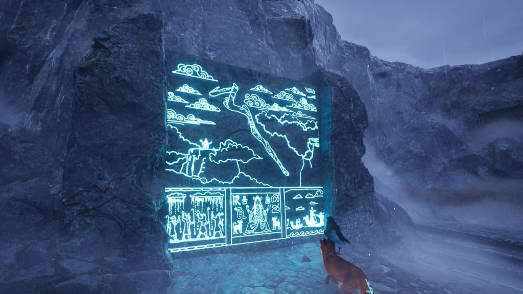 Cette aventure va donc se dérouler dans un vaste monde, qu’il faudra fouiller dans les moindres recoins pour espérer mener à bien votre mission. La particularité de ce jeu, c’est qu’il n’y a aucun dialogue. Mais rassurez vous on comprend très bien ce qu’il faut faire grâce aux diverses représentations murales que l’on trouve un peu partout, aux cinématiques mais aussi et surtout grâce aux parchemins disséminés aux quatre coins du monde. Cela permet de s’imprégner au mieux du lore.