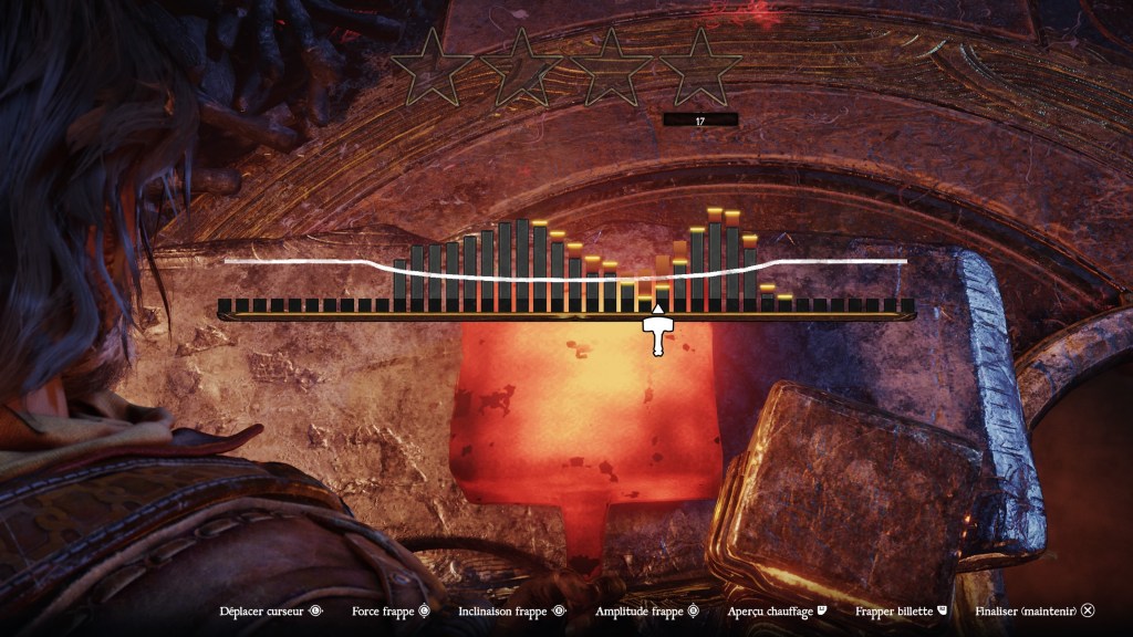 Et pour survivre dans ce monde sanguinaire, rien de tel qu’un arsenal tranchant. Et c’est à la force du poignet que vous allez œuvrer. Dans Blades of Fire, vous allez créer vous-même, vos lames en les forgeant grâce aux plans de fabrication ainsi qu’aux différentes matières premières que vous trouverez lors de vos pérégrinations. J’ai d’ailleurs trouvé que cet aspect technique était plutôt cool. Du moins de premier abord, car autant les premières fois, c’est super fun de fabriquer ses armes, autant au bout de la trentième fois, c’est moins marrant. Il y a malheureusement plusieurs problèmes. Bon déjà il faut choisir les différents éléments qui vont constituer votre arme, comme la matière première à utiliser puis la forme de la lame, celle de la poignée, etc…. Bon ça, ça va encore, mais ensuite il faut littéralement passer sur le grill de la forge et là, les choses se compliquent, car il va falloir frapper au bon endroit et avec le bon angle pour épouser au mieux la forme choisie. C’est hyper chaud. Surtout que si vous ne faites pas ça bien, votre arme aura une durée de vie limitée et surtout si vous n’obtenez pas d’étoiles, vous ne pourrez pas réparer votre arme par la suite. Ce qui implique que vous la perdrez très rapidement. C’est un des gros points noirs que j’ai relevé. Nos armes s’usent très (trop) rapidement et cassent en combat comme des brindilles. J’étais d’ailleurs beaucoup plus frustré de perdre mes armes durement forgées que de me faire tuer par un ennemi. C’est pour dire…