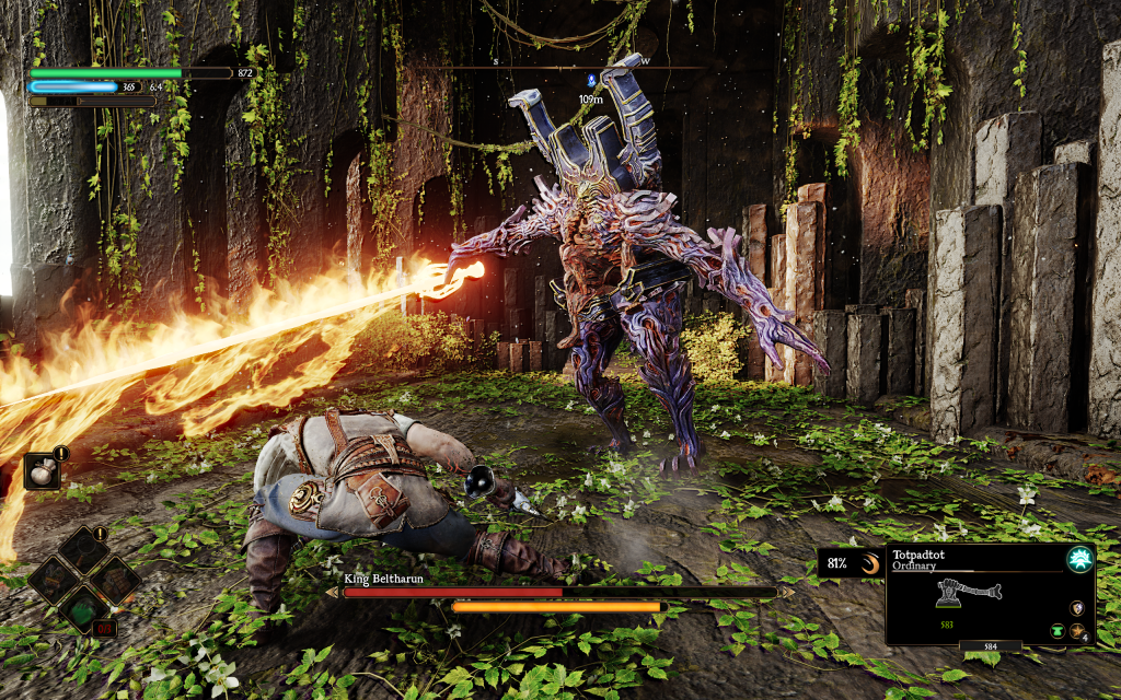 Comme dans tous les jeux du genre, à chaque fois que vous mourrez, vous perdez quelque chose, ici c’est l’arme que vous portiez juste avant votre trépas. Vous pourrez la récupérer si vous réussissez à revenir au même endroit, en passant sur la rune brillante. Alors pas de panique, il y en a un peu partout disséminés sur la map des enclumes qui servent de point de sauvegarde. Vous pourrez aussi vous téléporter entre chaque point ainsi que pour accéder à la forge. Au moins pas besoin de retraverser chaque zone de part en part. C’est cool mais cela enlève aussi du challenge. Qui ne manque tout de même pas car le jeu est difficile, voire très difficile. Les ennemis sont nombreux, frappent fort et une fois que vous avez perdu votre arme fétiche, vous vous retrouvez à partir à l’assaut avec vos armes restantes qui sont forcément moins efficaces. Où alors il faut en reforger une autre, du moins si vous avez les ressources nécessaires. Ce qui n’est pas gagné d’avance…