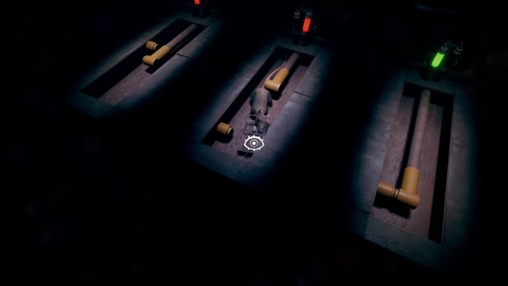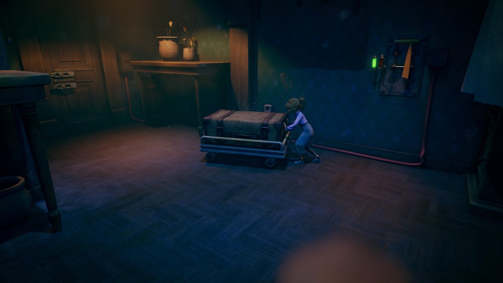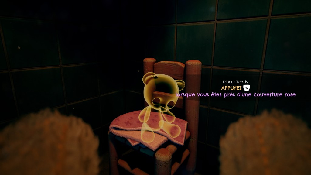 Le gameplay est vraiment intéressant puisque nous allons alterner entre vue à la première et à la deuxième personne. Puisqu’en réalité, notre vision du monde ne sera qu’au travers des yeux de Teddy, l’ours en peluche. J’ai trouvé que cette approche était vraiment excellente et était un point majeur de l’expérience. On dirige donc Sophie, bah ouais, un ours en peluche, même doté de la vision, ça ne marche pas tout seul et il faudra bien analyser chaque recoin pour voir ce qu’il y a à faire. En sachant que lorsque Sophie tient sa peluche dans les bras, elle ne pourra réaliser aucune action. Mais pas de panique, vous pourrez poser Teddy à certains endroits stratégiques, représentés par de petites couvertures roses. On y voit d’ailleurs en surbrillance la forme de l’ourson. Cela peut paraître simple, mais méfiez-vous de l’eau qui dort, car les énigmes sont nombreuses et pas toujours évidentes au premier abord. Il faudra surtout bien regarder partout, car il y a souvent plusieurs endroits où vous pourrez poser Teddy, et chaque position a son propre point de vue. La plupart du temps, il faudra rester le plus discret possible pour ne pas se faire repérer, une jauge violacée apparaît lorsque vous faites trop de bruit. Ce qui nous force à être constamment aux aguets et augmente notre concentration dans le jeu. Les actions possibles sont assez simples, marcher, se baisser, surélever les bras pour poser notre ours en hauteur, et saisir des objets comme des clés ou des chariots. Les énigmes sont nombreuses, ça, je vous l’ai déjà dit, mais relativement simples, pas de réelles difficultés. Il faudra simplement être logique et vous ne devriez jamais avoir de problème. Le seul point noir que j’ai relevé est lors des scènes « d’action », je ne vous spoilerai rien, où il est plus délicat de diriger Sophie. Après, rien d’insurmontable, et après quelques tentatives, on y arrive bien.