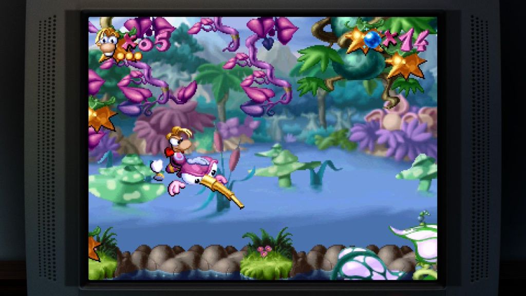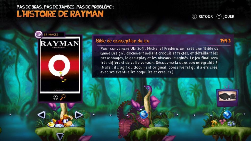 La compilation propose également plus de 120 niveaux supplémentaires issus de Rayman’s New Levels, Rayman 60 Levels et Rayman By His Fans, ainsi qu’un prototype Super Nintendo jamais commercialisé. La bande originale a été revisitée par Christophe Héral, et un documentaire interactif de plus de 50 minutes vient enrichir l’ensemble avec interviews, croquis et documents d’époque. Des options modernes, rembobinage, sauvegardes multiples, vies infinies, déblocage instantané des niveaux rendent l’expérience plus accessible aujourd’hui.