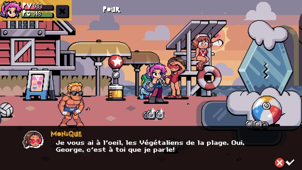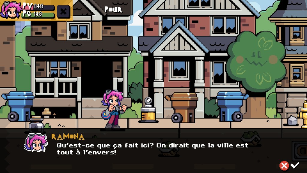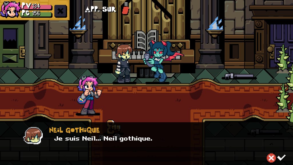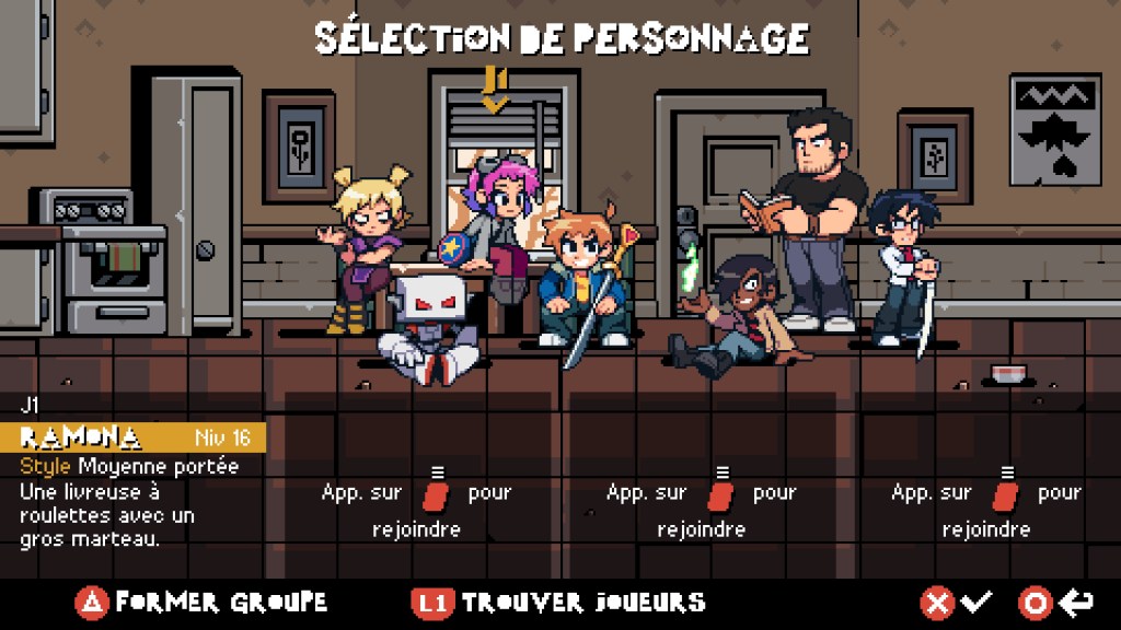 Ce Scott Pilgrim EX est clairement tourné pour le jeu en coopération puisque vous pourrez partir à l’aventure jusqu’à 4 joueurs en local ou en ligne. Entendons-nous bien, vous pouvez tout à fait jouer en solo comme je l’ai fait, mais rien ne vaut les fous rires et le grand n’importe quoi à l’écran lors de parties endiablées en compagnie de ses amis. Il y a des jeux comme ça qui se prêtent parfaitement à se rassembler et ce Scott Pilgrim EX est de ceux-là. Le gameplay est extrêmement jouissif, c’est hyper fluide et rempli de détails. D’ailleurs, bon nombre d’éléments à l’écran pourront vous servir d’armes pour occire les belligérants qui vous feront face. Vous pourrez également détruire une partie du décor pour récupérer de l’argent ou des bonus bien utiles pour améliorer votre équipement et battre plus facilement vos ennemis. Vous pourrez alors partir en virée shopping dans les nombreuses boutiques qui jalonnent votre périple. Cela est même extrêmement recommandé car, au fur et à mesure de votre progression, les méchants seront de plus en plus coriaces.