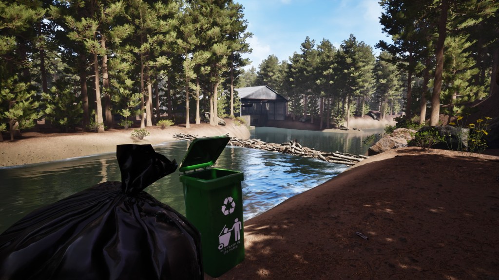 Ce FPS à petit budget est plutôt bien foutu, la progression est fluide et je n’ai pas rencontré de réels problèmes de bugs. Le seul véritable point noir que j’ai eu est d’ordre logique. Je m’explique, au tout début du jeu, on nous demande de nettoyer la maison qui a été occupée par de jeunes fêtards. Pour le moment, rien de bien compliqué : on s’arme d’un sac poubelle et on ramasse les différentes ordures aux quatre coins de la maison. Ensuite, le jeu nous indique d’aller jeter ce fameux sac dans un conteneur, et c’est là que tout se complique. J’ai tourné pendant un bon moment dans et autour de la maison avant de finalement trouver cette fameuse poubelle, qui se trouvait au bord de la rivière, tout de même assez loin de l’habitation. La seule question que je me suis posée, c’est pourquoi diable installer ça ici ? Mis à part cette bizarrerie logistique, j’ai bien apprécié cette parenthèse loufoque où votre pire ennemi est un castor qui a la rage et pour qui le mot vengeance a une saveur particulière. L’intelligence qu’il va développer pour vous faire payer l’affront d’avoir détruit son barrage est diabolique. Le scénario suivi est digne d’un film de série B et c’est un vrai vent de nostalgie d’une époque révolue. Ça fleure bon les années 80 !