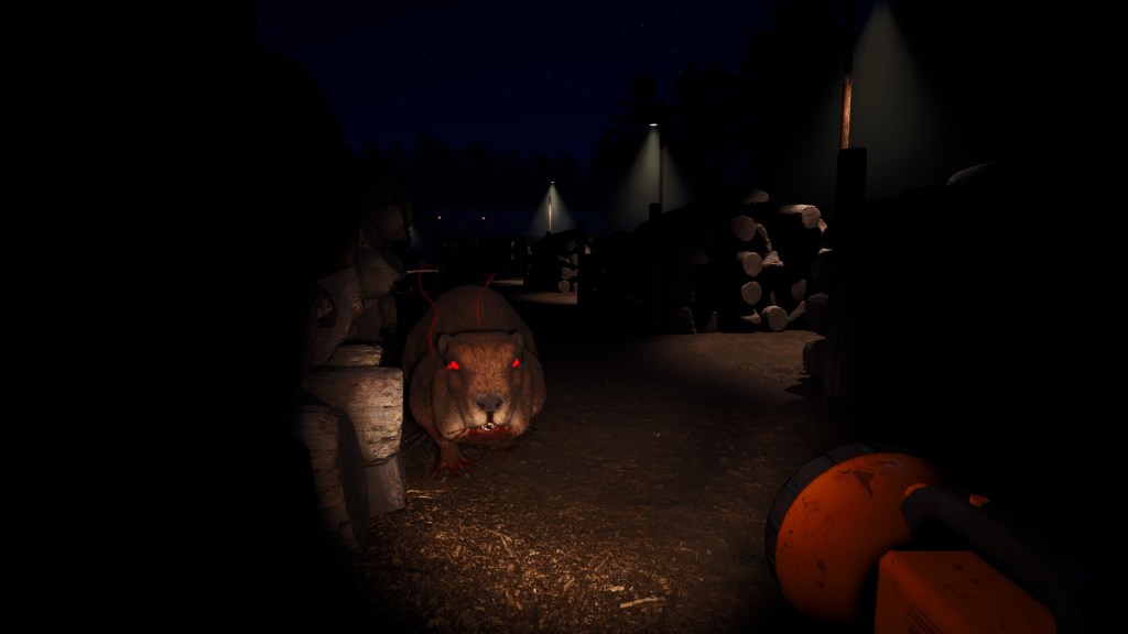 Comme d’habitude, on va commencer par l’histoire, vous allez incarner un homme banal qui pensait venir se ressourcer dans un chalet à la montagne pour le week-end. Après vous être installé, vous faites un peu de ménage et allez jeter vos ordures dans la poubelle. Malheureusement, cette dernière tombe dans la rivière et va détruire le barrage du castor du coin. Une action malencontreuse qui va transformer votre idyllique pause forestière en une descente aux enfers meurtrière. Car oui, ce castor n’est pas commode et il va vous en faire voir de toutes les couleurs. C’est sur ce pitch rocambolesque que nous allons débuter notre test.