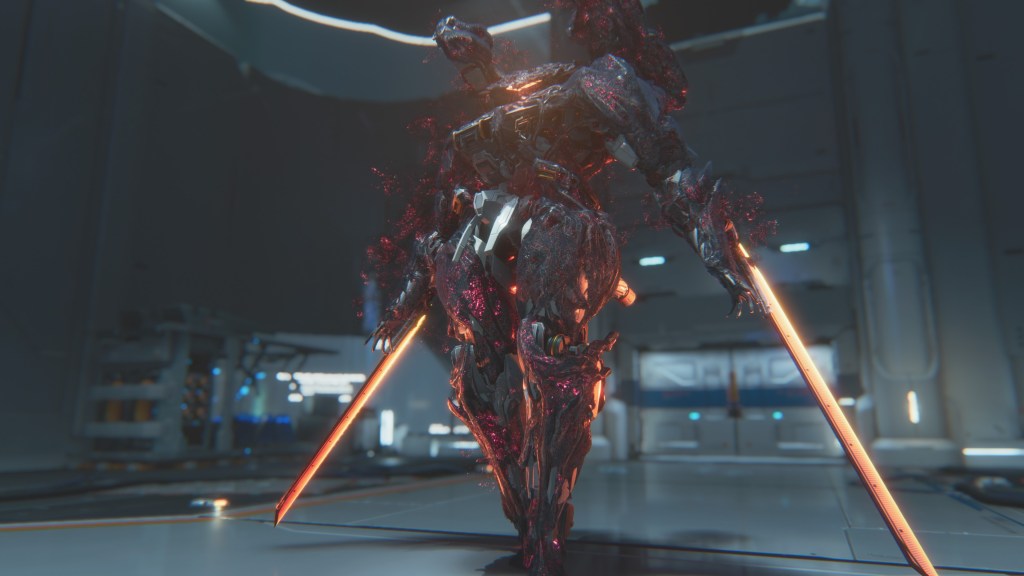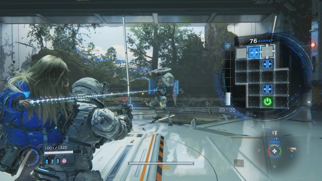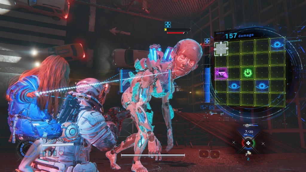 Qui dit nouvelle licence dit forcément gameplay innovant, et ce n’est pas ce Pragmata qui dérogera à la règle. Car ici il ne va pas juste falloir tirer sur tout ce qui bouge pour vous en sortir. Avant cela il faudra hacker votre adversaire pour l’ouvrir et ainsi le rendre vulnérable à vos munitions. Sans cette action primordiale, vos tirs seront aussi efficaces qu’un moustique s’écrasant sur votre voiture, c’est dire… Le jeu implémente donc une mécanique de puzzle au cœur de l’action. Ce qui paraissait complètement lunaire jusqu’à aujourd’hui. Ouais super jeu de mot je sais. Je dois bien vous avouer que la prise en main au début est assez délicate et on se prend quelques coups des ennemis. Mais une fois que vous avez pris le coup, c’est plutôt kiffant. Surtout qu’au fur et à mesure de votre avancement dans l’histoire, vous débloquez de nouveaux pouvoirs et capacités qui s’activent lors de ces phases de piratage et qui font des dégâts dévastateurs. Il faudra donc cheminer d’un point A à un point B en passant par différents nœuds qui activent telle ou telle action. Dit comme cela peut paraître compliqué mais dans les faits cela est assez simple et le jeu vous l’explique très bien. Avant chaque run, vous pouvez construire votre build en fonction de vos acquis et ainsi partir sereinement à l’assaut de la prochaine zone.